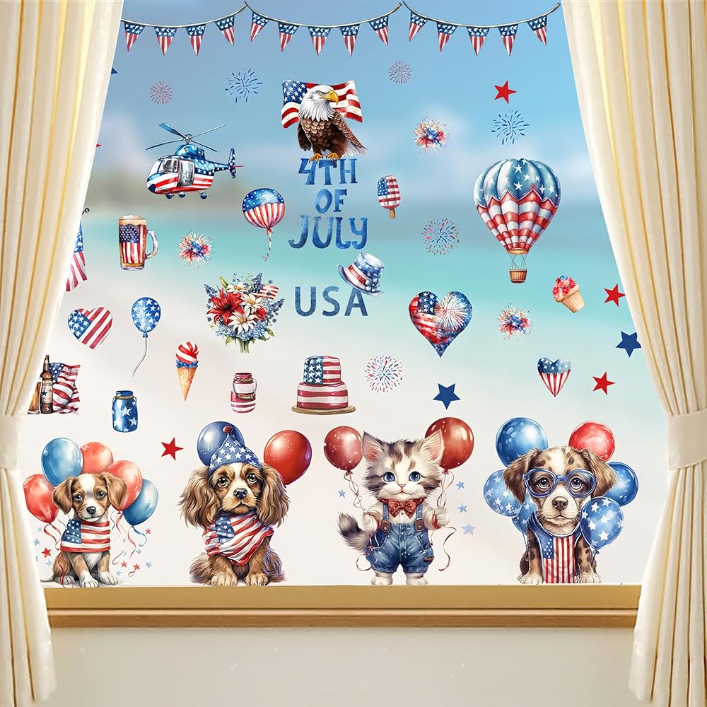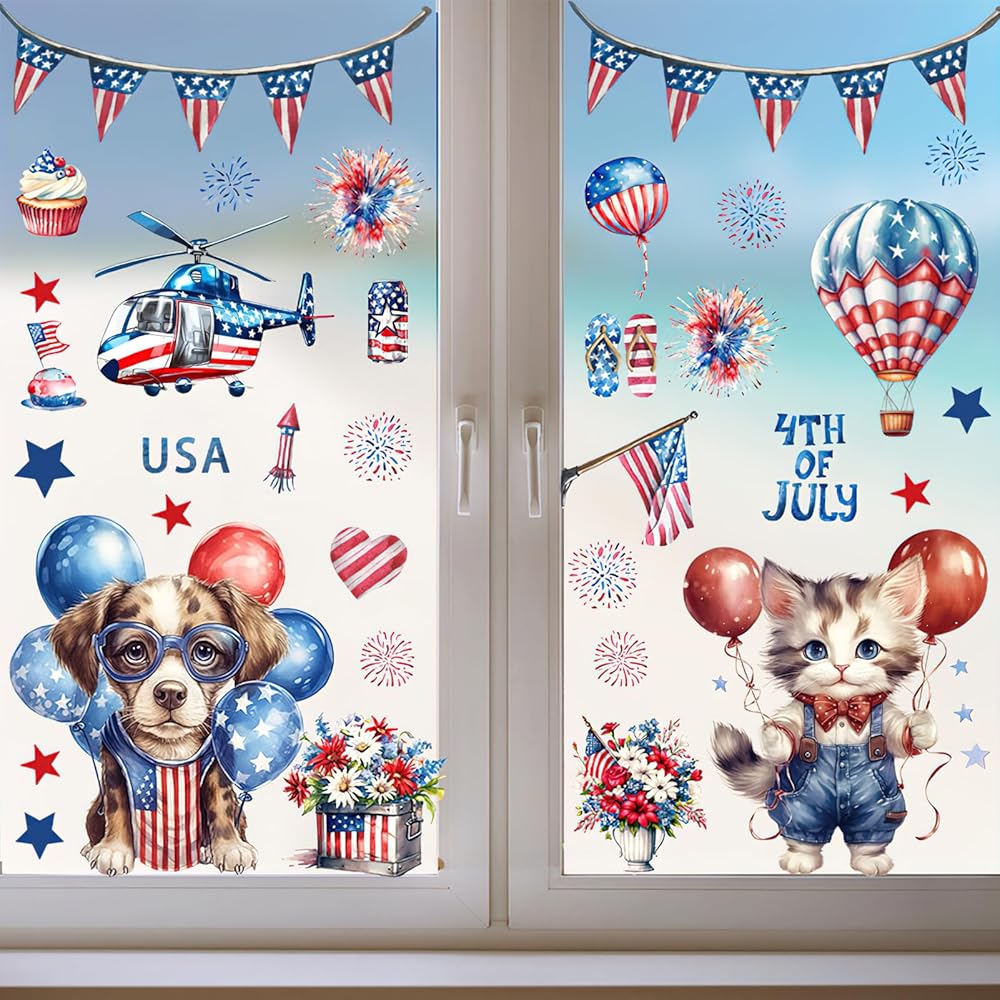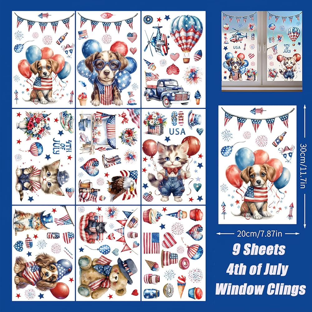 132 قطعة من ملصقات النوافذ في الرابع من يوليو، ملصقات نافذة يوم الاستقلال الوطني، ملصقات لطيفة على شكل قطط وكلاب، ملصقات نافذة على شكل نجمة للألعاب النارية على شكل زهور لتزيين النوافذ الزجاجية، لوازم الحفلات 9 أوراق