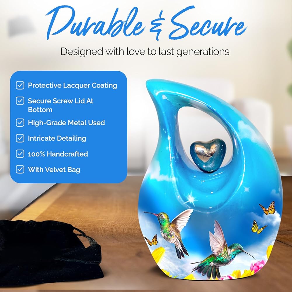 جرة حرق الجثث عالية الجودة ومتينة: هذه الجرة الجميلة على شكل دمعة صلبة ومصنوعة من معدن عالي الجودة مع لمسة نهائية لامعة. تم تصميم جرة الرماد المعقدة يدويًا على يد حرفيين ذوي مهارات عالية باستخدام التقنيات التقليدية العريقة. كن مطمئنًا، هذه الجرة الرائعة على شكل دمعة ستكون بمثابة رمز مؤثر لذكرى أحبائك.