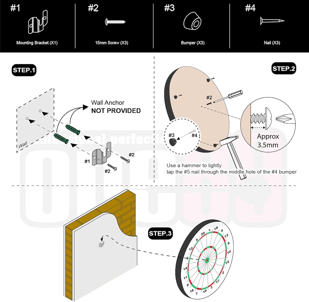 - خطوات التثبيت: 1) تثبيت دعامة التثبيت على الحائط. 2) ربط المسمار والمصد بالجزء الخلفي من لوحة رمي السهام، أبقِ غطاء المسمار بعيدًا عن اللوحة الخلفية بحوالي 3.5 سم. 3) تثبيت دارتبوارد على الحائط