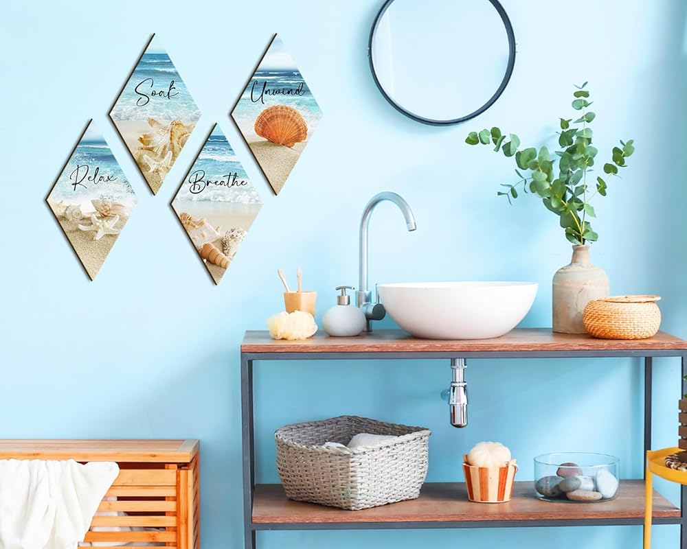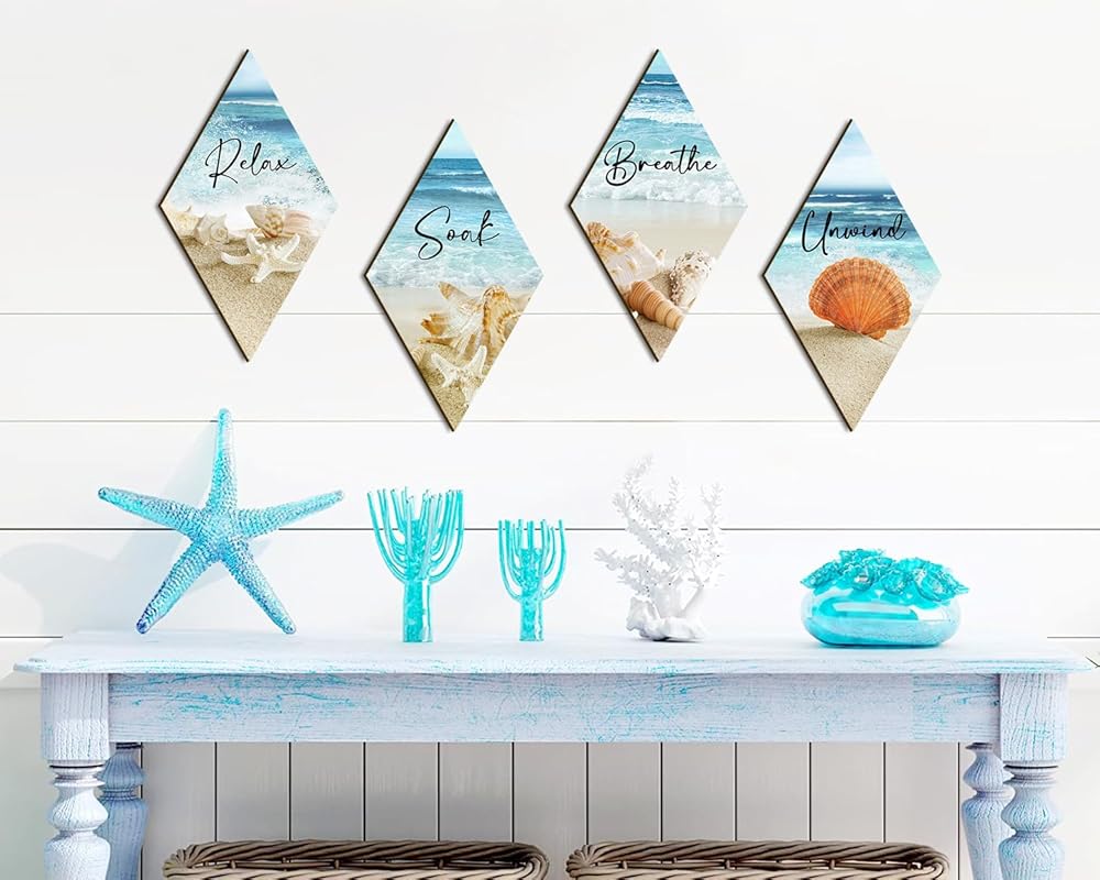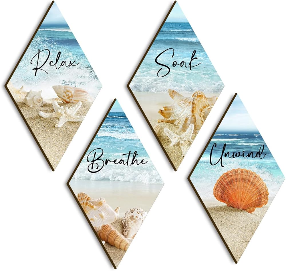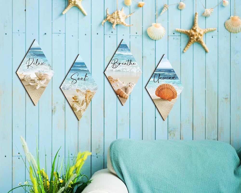 ديكور جدار الحمام، شاطئ المحيط، الاسترخاء، الاسترخاء، نقع التنفس، جدار الفن المزرعة، لوحة خشبية ريفية، علامة مطبوعة خشبية عتيقة، ديكور سبا للحمام (الماس)