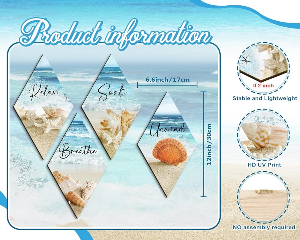 • 【Coastal Escape】: Create a tranquil oasis in your bathroom with this beach and ocean-themed wall decor. The serene design and soothing colors transport you to a calming seaside retreat.