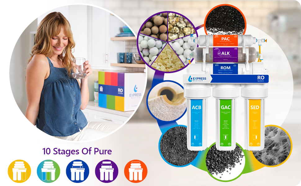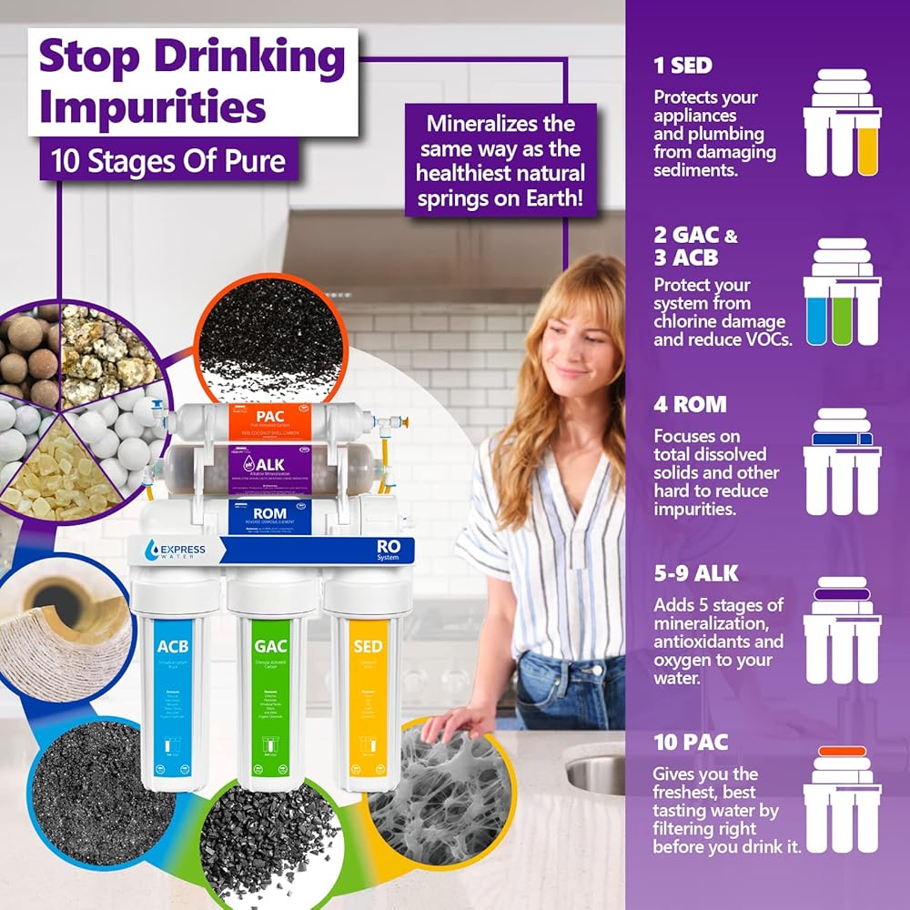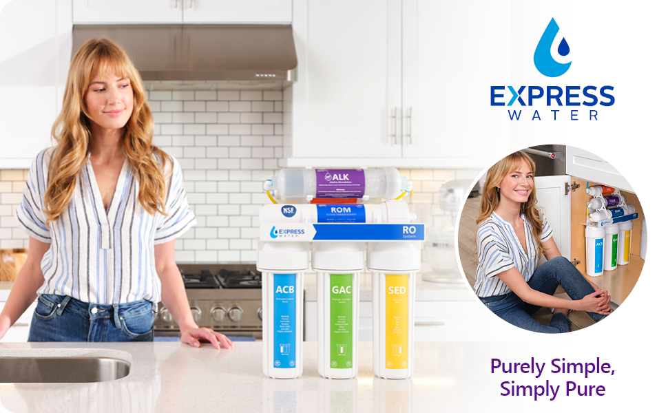 فلتر المياه بالتناضح العكسي: اختبر مذاق المياه مع نظام تنقية المياه بالتناضح العكسي Express Water الذي يزيل ما يصل إلى 99.99% من الرصاص والكلور والفلورايد والنترات والكالسيوم والزرنيخ والبكتيريا والمزيد. فلتر المياه القلوية: فلتر المياه القلوية من Express Water مع تقنية المعادن النشطة يضيف الكالسيوم والبوتاسيوم والمغنيسيوم والمعادن الأخرى إلى الماء.