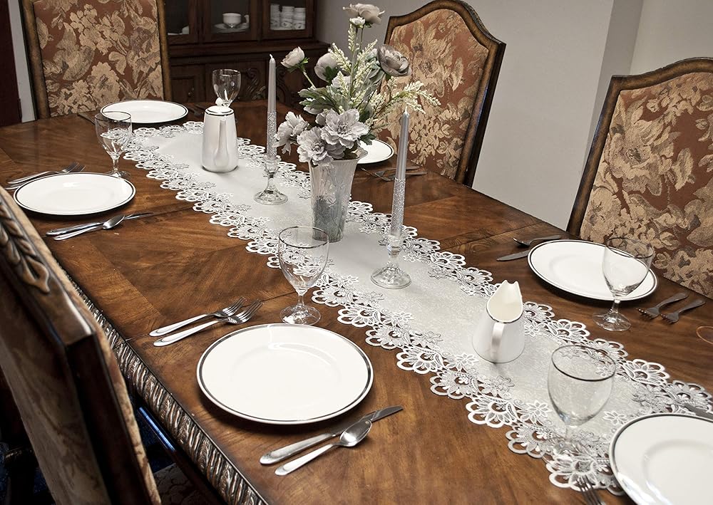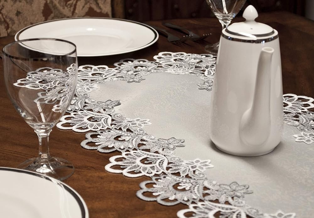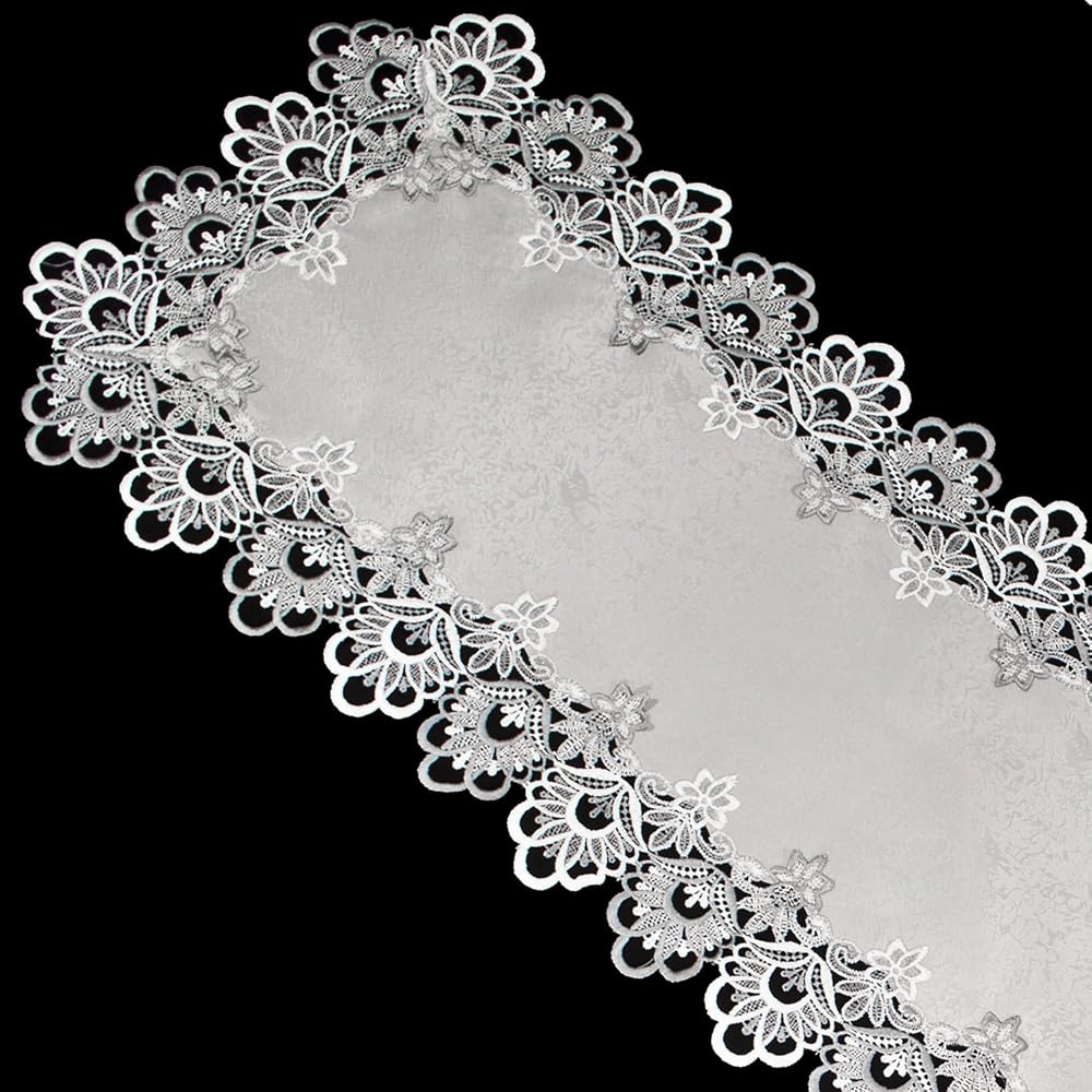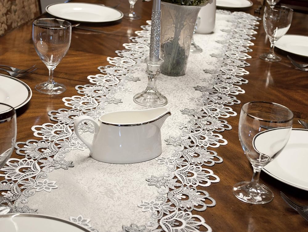 ELEGANT LACE: Beautiful Silver European Lace with Antique Fabric 16" X 70" Runner will make your Wedding, 25th Anniversary or Everyday decor shine and your guest will be delighted with the nice look of elegance