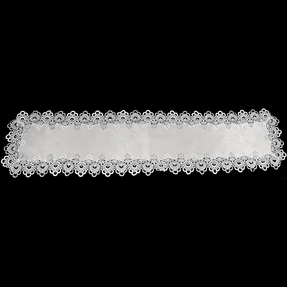 Bring a touch of elegance to your table with the Silver Antique Jacquard Peacock Tail Lace 16" X 70" Runners. Beautiful Silver European Lace with Antique Fabric Runners will make your Wedding, 25th Anniversary, or Everyday decor shine and your guests will be delighted with the nice look of elegance. Nice for a table runner for your dining room table or a dresser scarf to protect your dresser in the bedroom, the runner will bring elegance to your home. Suitable also for your coffee table, sofa table, entryway table, and buffet. Fits a dining room table for 8-10 people and is washable with little to no ironing. Other matching items such as round doilies, placemats, table-toppers, and other runners in several lengths are available.
