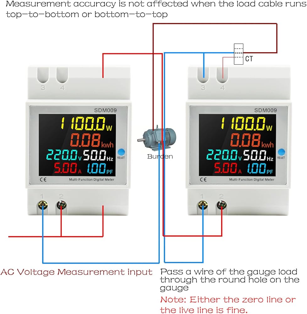 3. Connections of meter with external current transformer as diagram 2. Pass the wire through the hole in the meter, and connect the two wires from the secondary transformer to terminals 3 and 4.