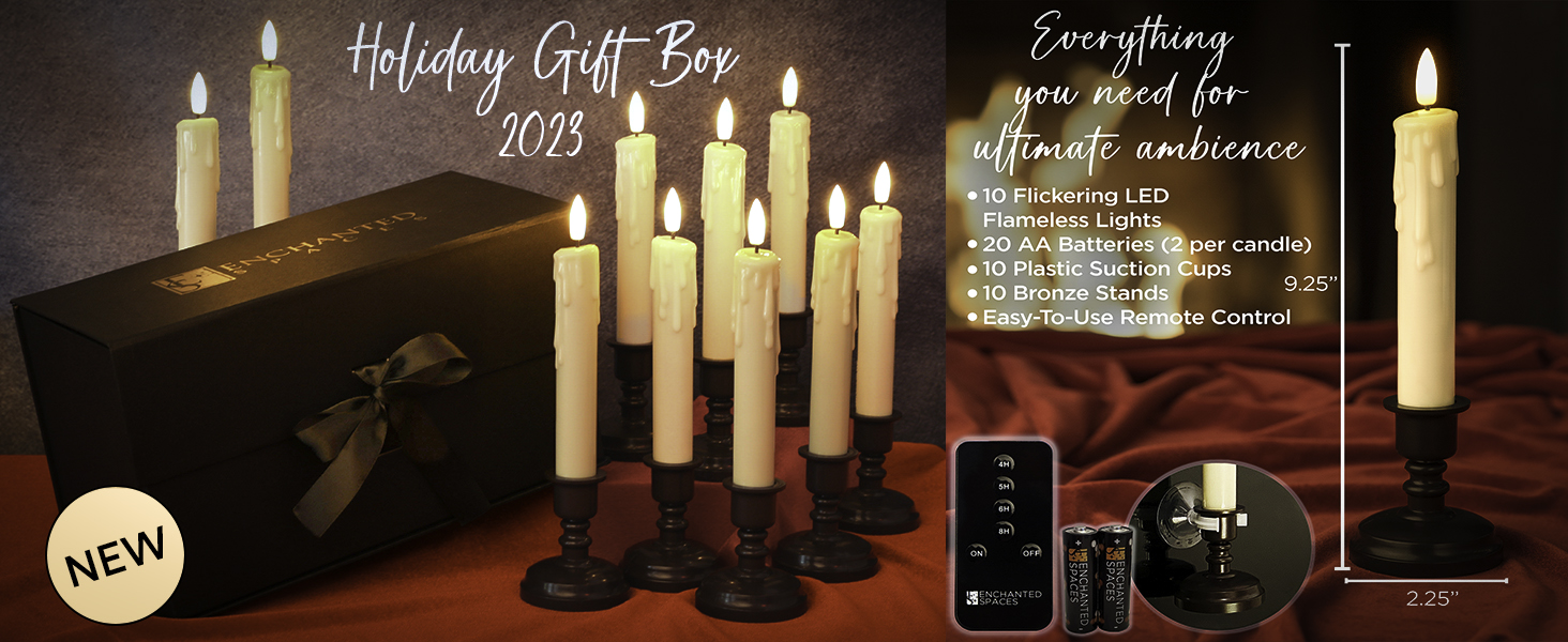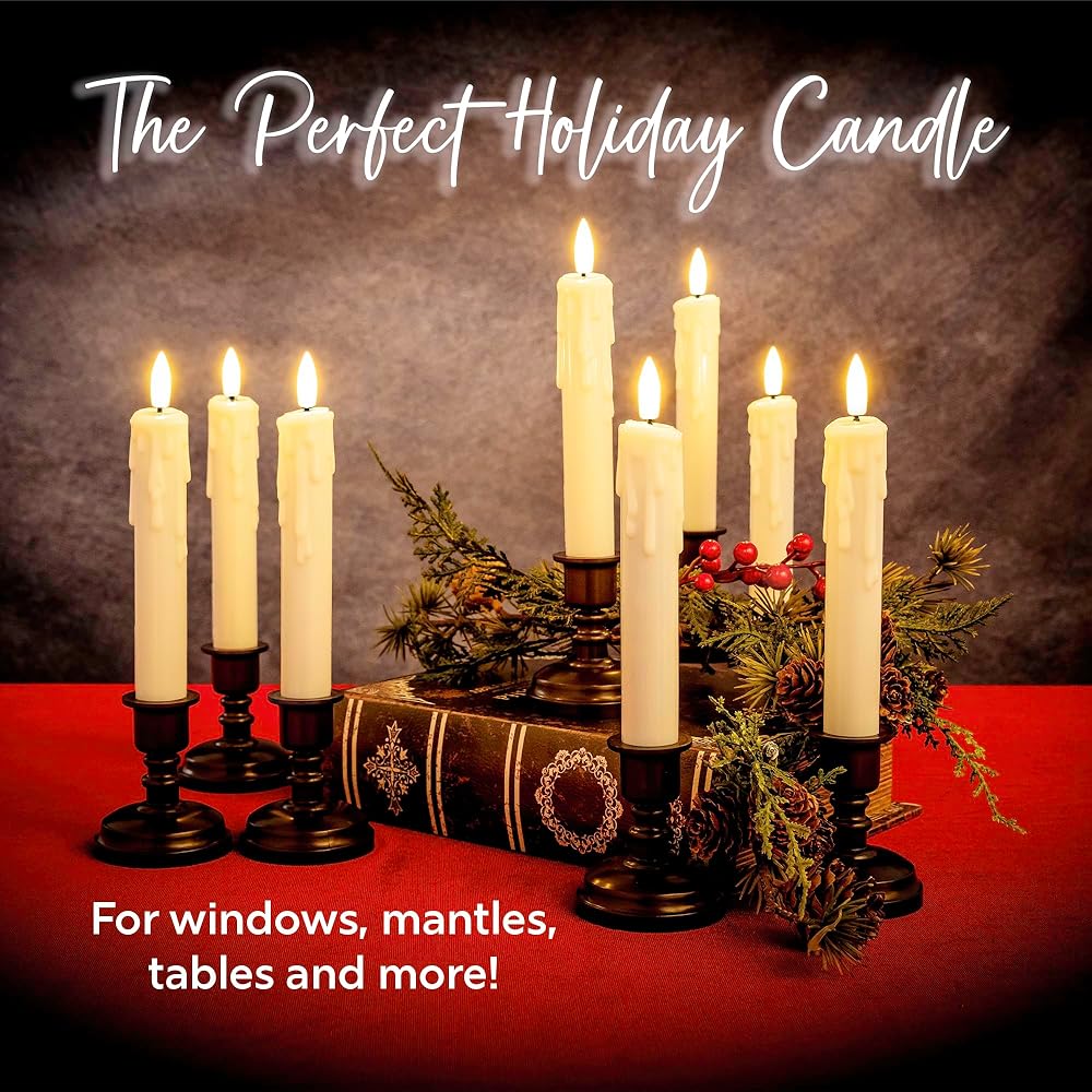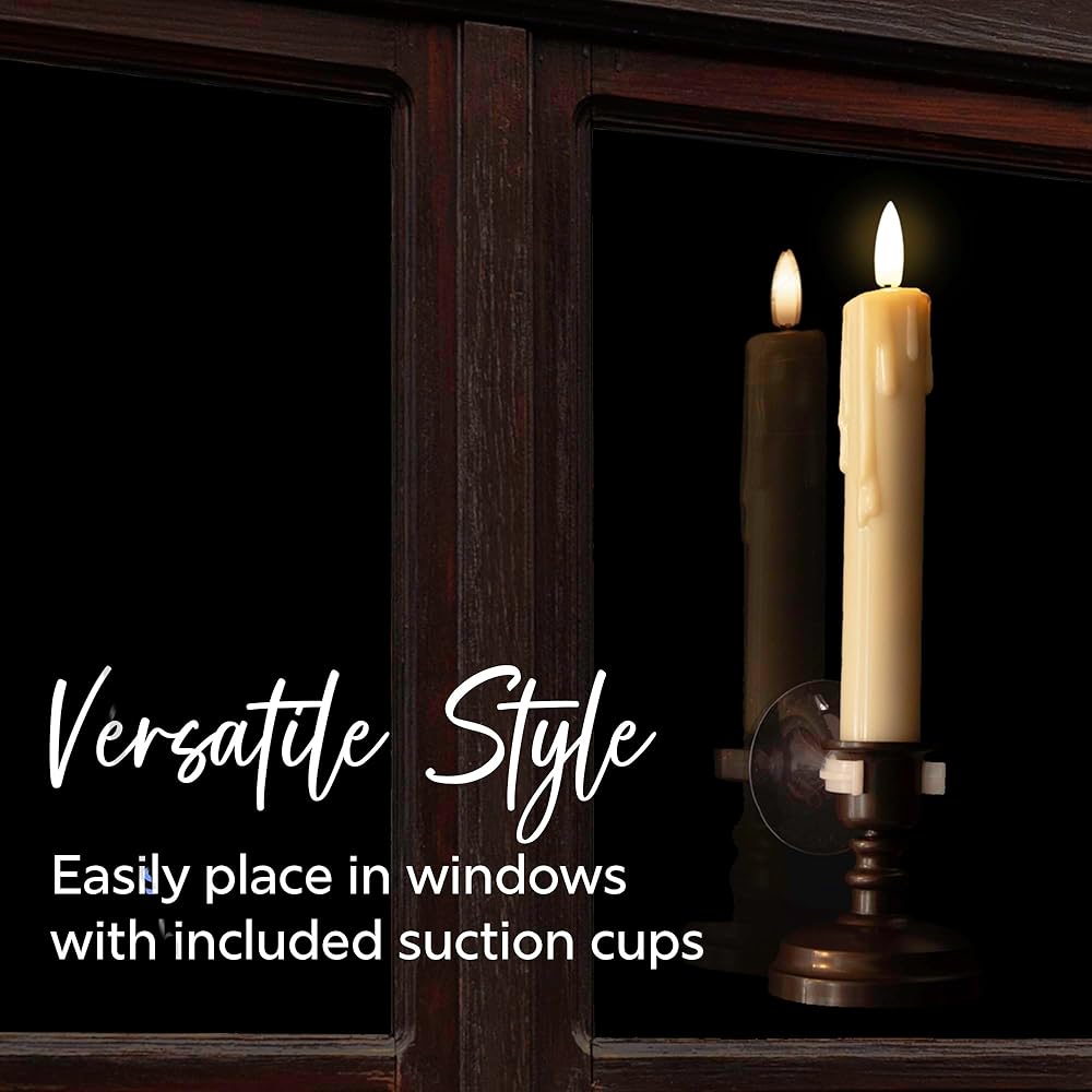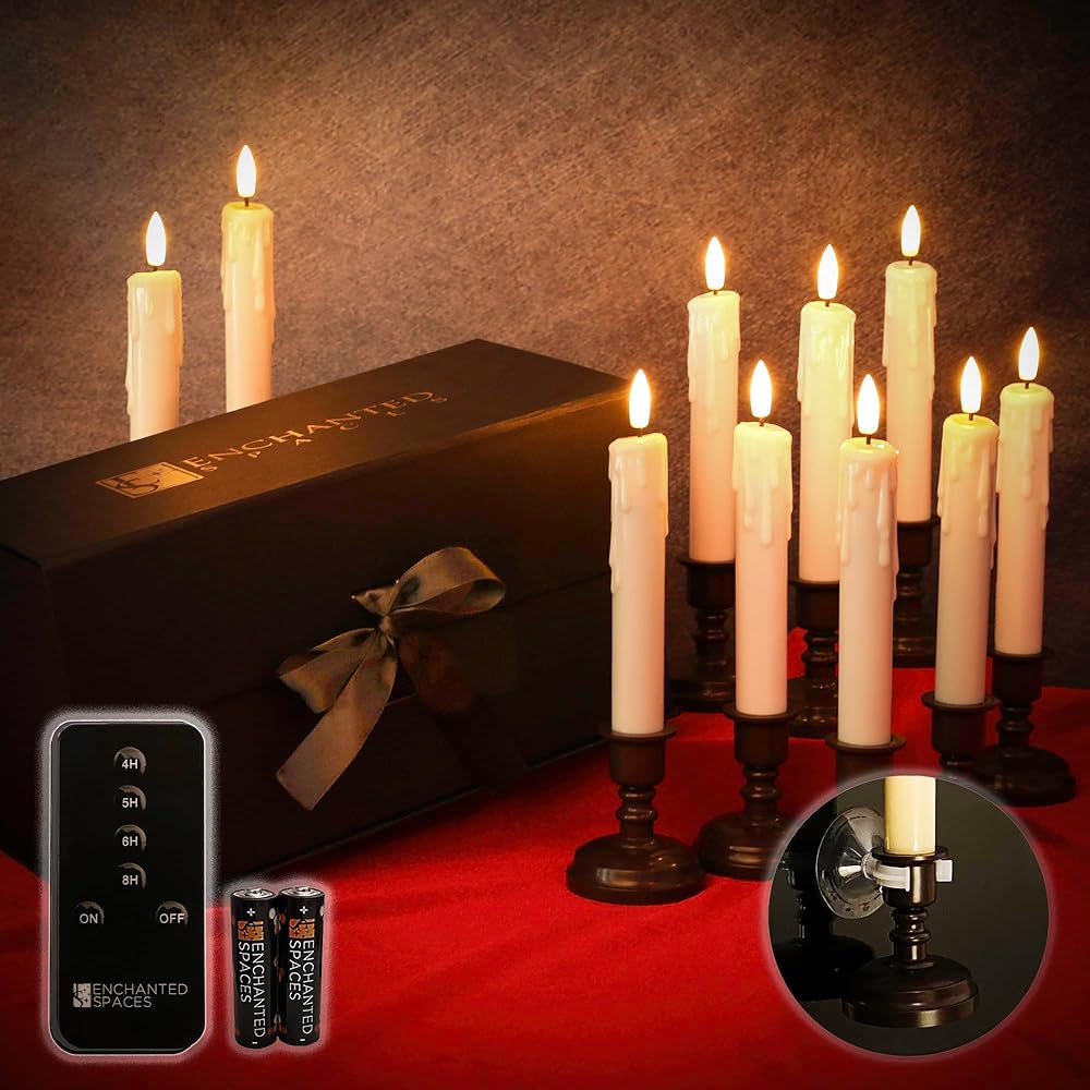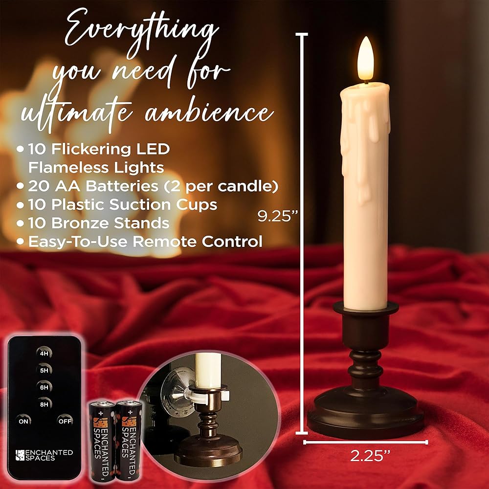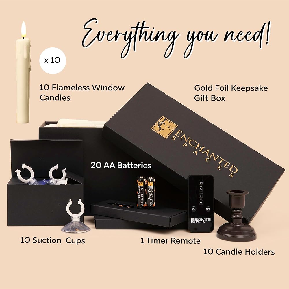 تتضمن كل ما تحتاجه: تتضمن 10 شموع نافذة مع فتائل سوداء واقعية، وحوامل شموع بلاستيكية برونزية قابلة للإزالة، و10 أكواب شفط، و20 بطارية (2 لكل شمعة)، وجهاز تحكم عن بعد مع مؤقت يومي.