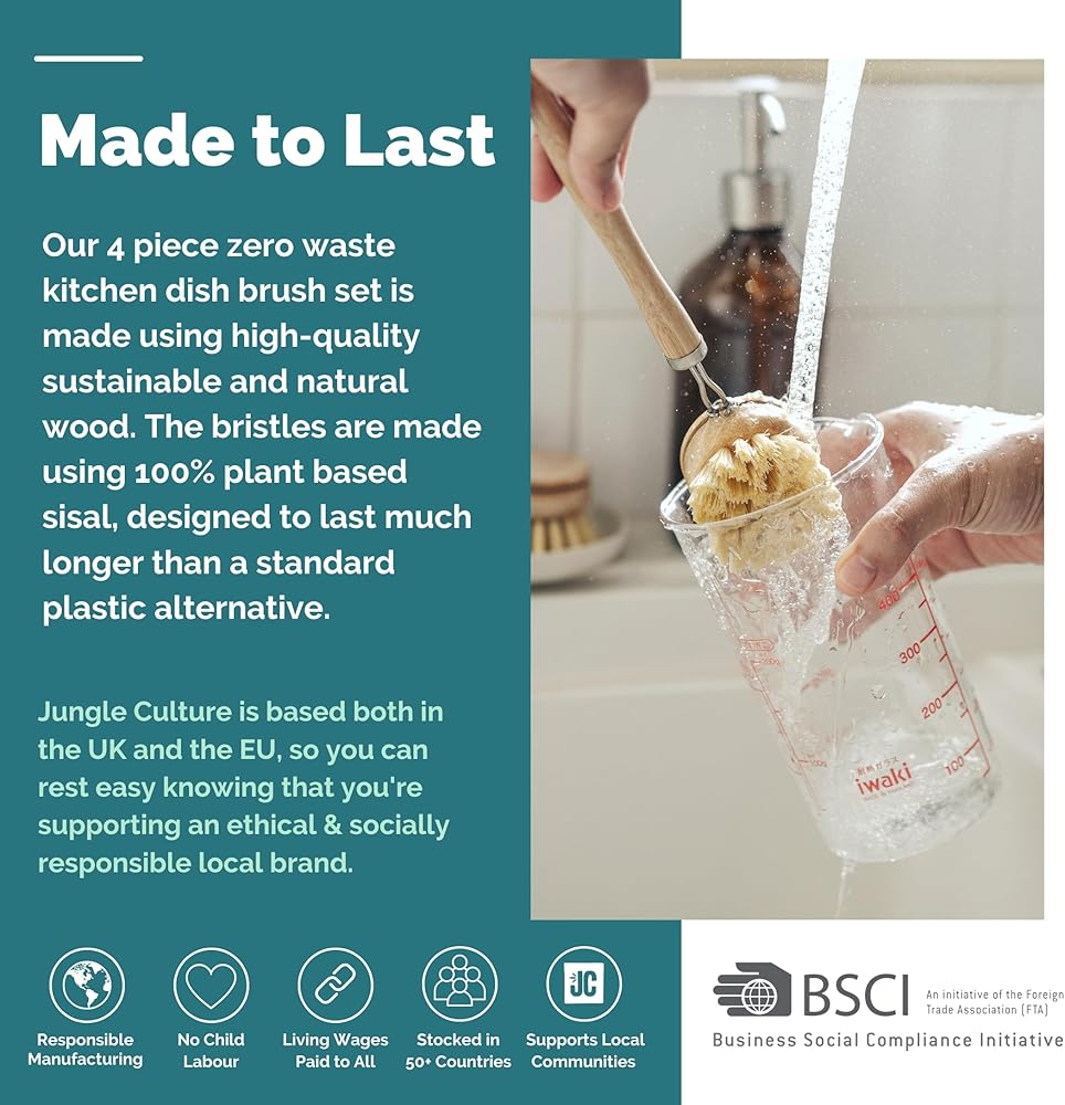 🌿 صديقة للبيئة وقائمة على النباتات: مجموعة فرش تنظيف أطباق المطبخ الخالية من المخلفات مصنوعة باستخدام خشب طبيعي ومستدام عالي الجودة. الشعيرات مصنوعة باستخدام ألياف قشر جوز الهند والسيزال النباتية بنسبة 100%، وهي مصممة لتدوم لفترة أطول بكثير من البدائل البلاستيكية القياسية.
