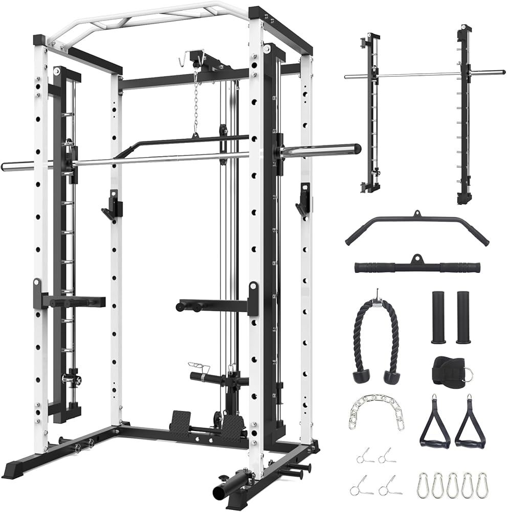 قفص طاقة مع سميث بار - حامل طاقة ممتاز بوزن 1600 رطل مع منسدلة للأسفل، ورف طاقة مع نظام بكرة الكابل، ومقابض غمس وخطافات على شكل حرف J، ومعدات رياضية منزلية للتدريبات المتنوعة
