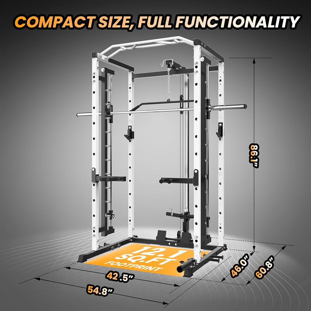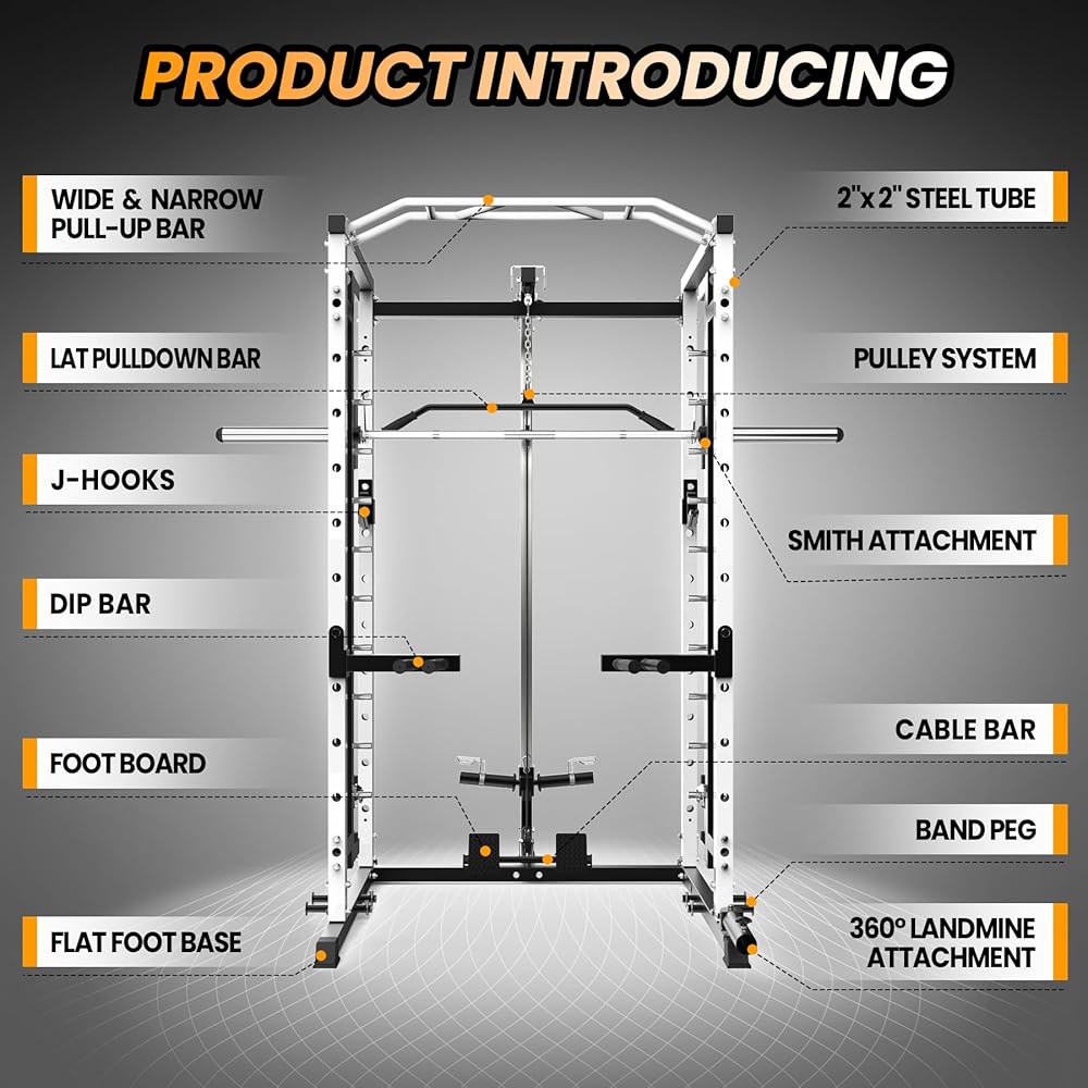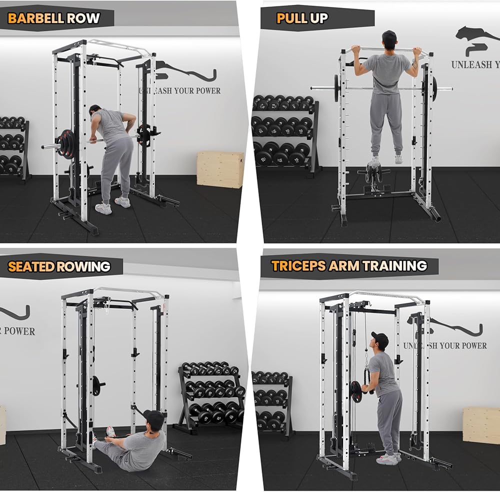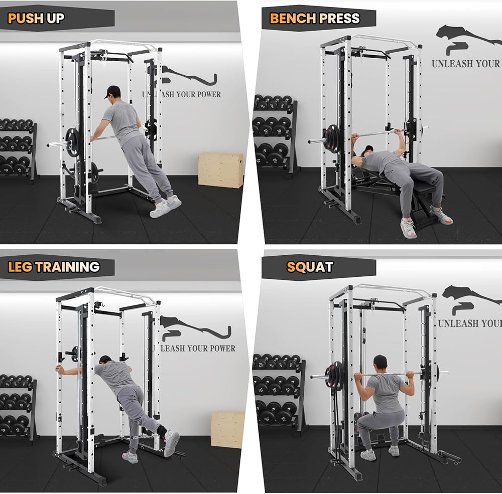 Endless Training Options: Dive into a variety of exercises including squats, bench presses, pull-ups/chin-ups, dips, and more with our multifunctional power cage, enhancing your strength training safely and effectively. In addition, our power rack is equipped with SmithBar, which is very suitable for people who are new to strength training. It provides sufficient safety protection and is not easy to get injured.