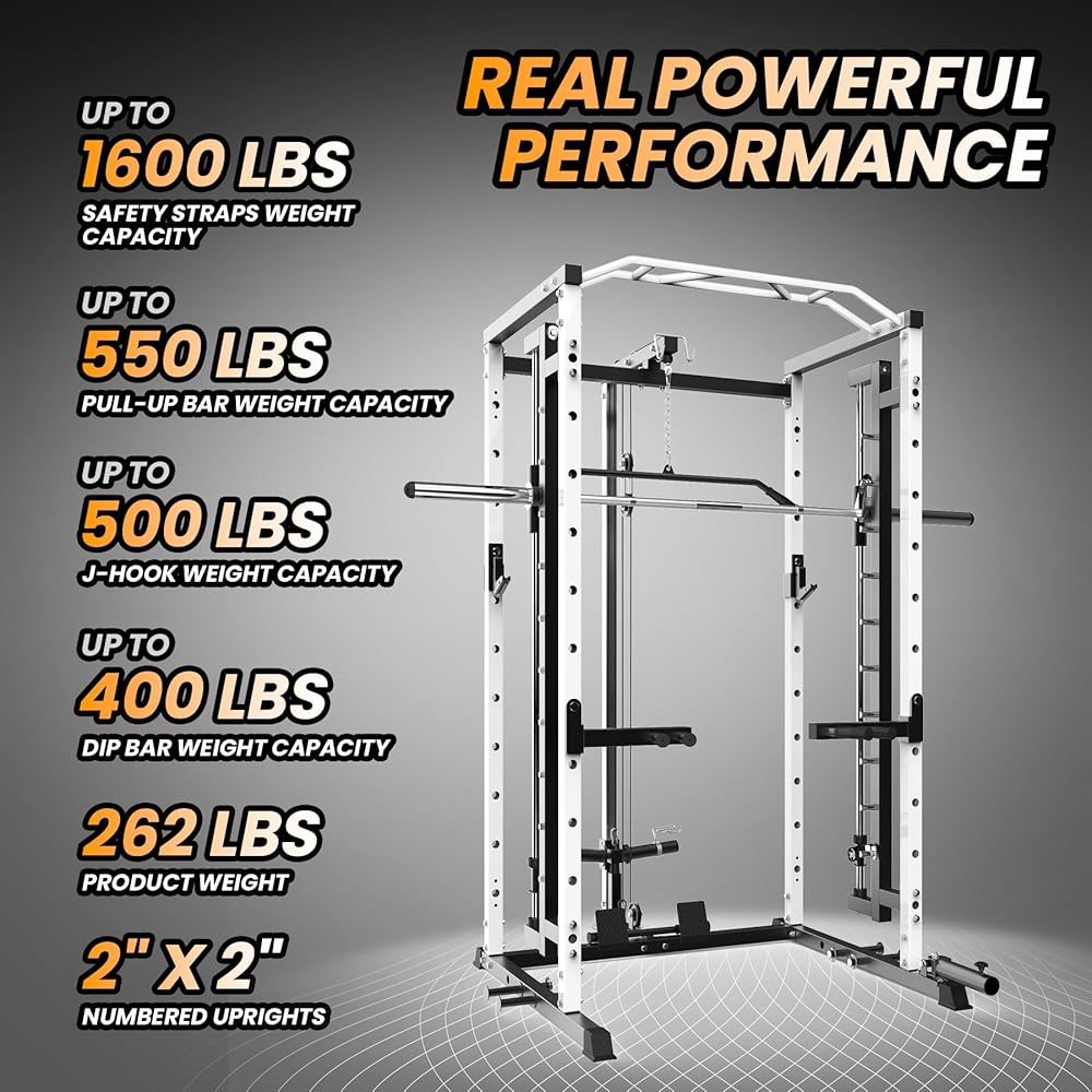 Gym-Quality Build: Crafted with precision, featuring 2" x 2" steel uprights and a powder-coated finish, our power cage stands up to 1600 lbs, offering superior durability and stability.