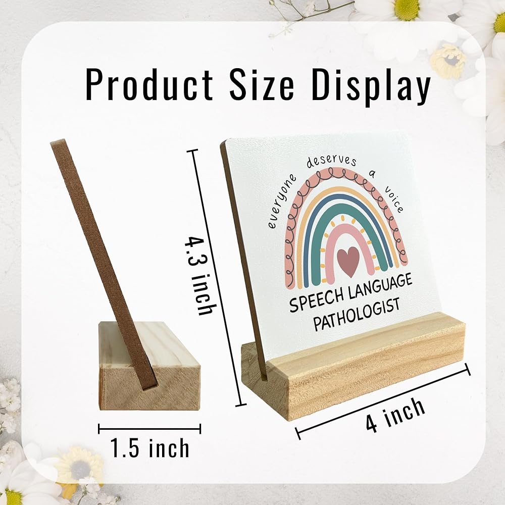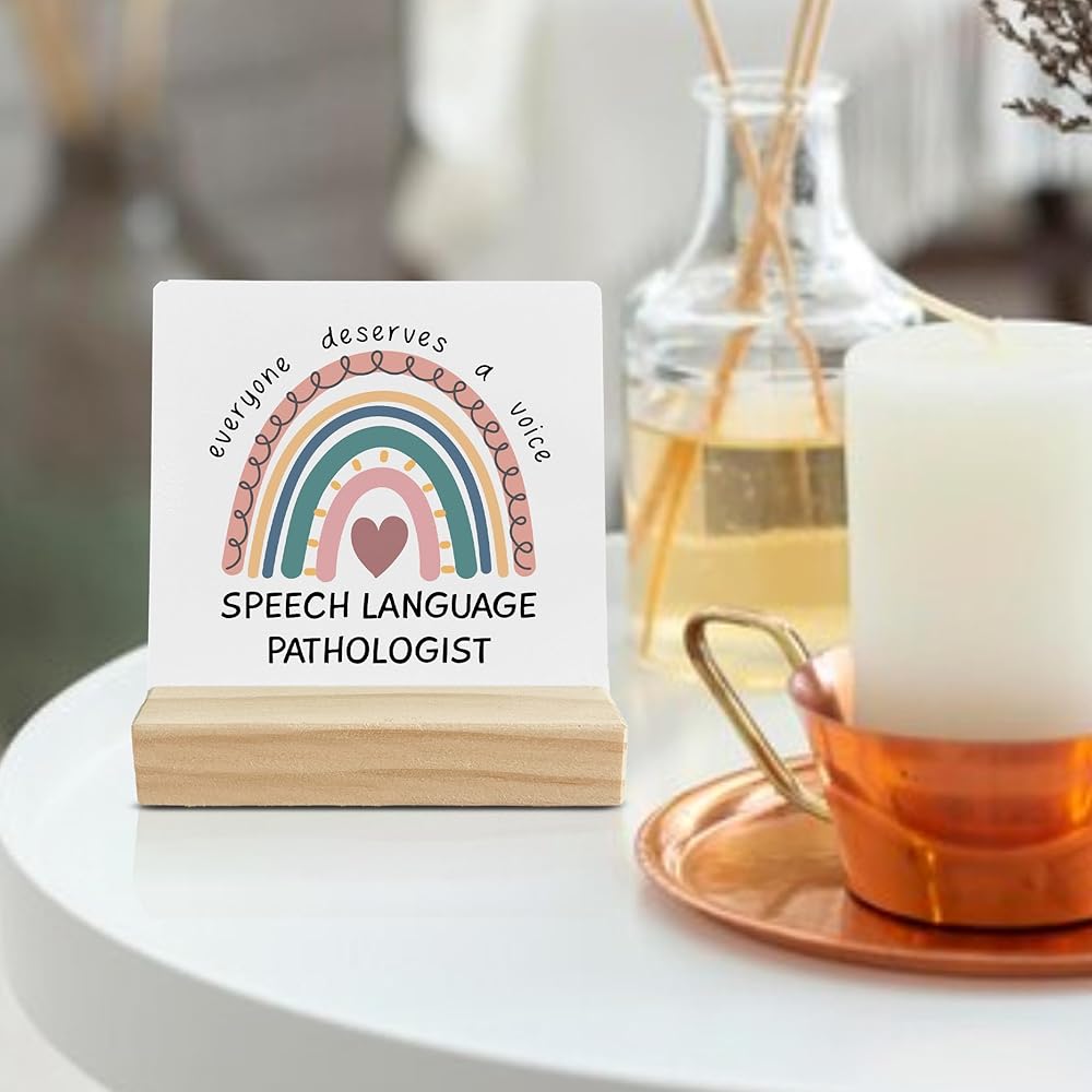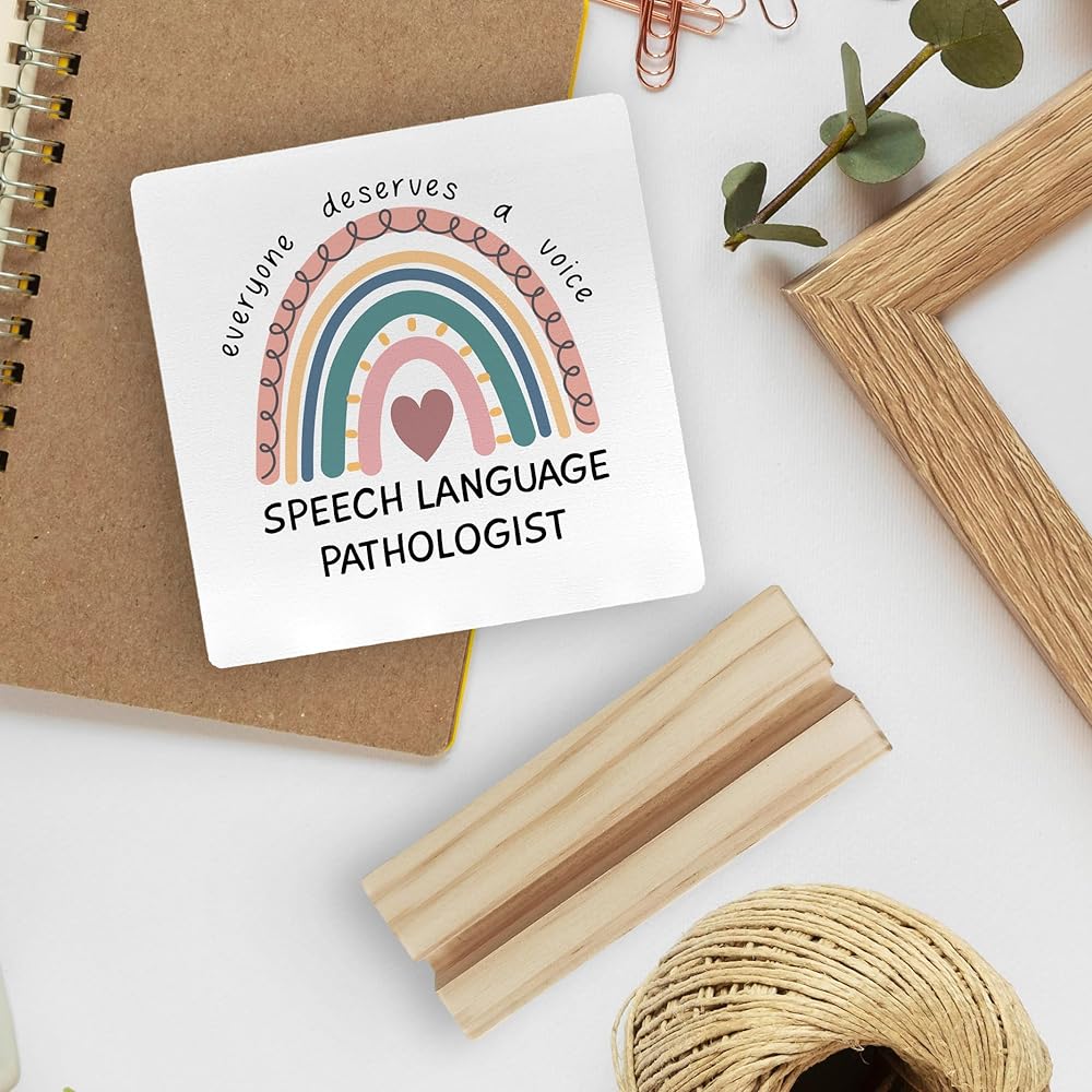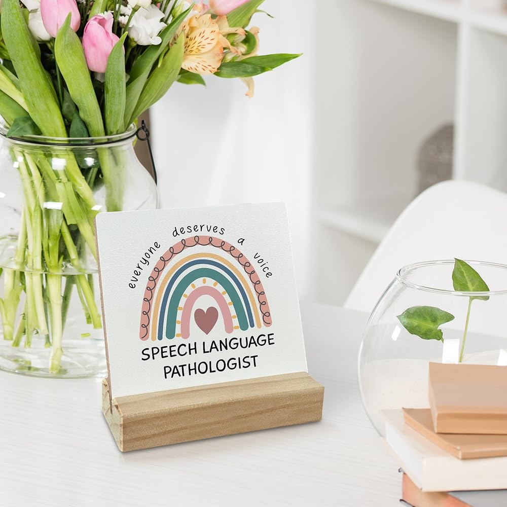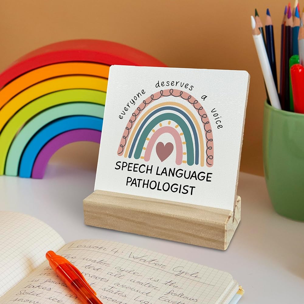 ديكور مكتب هدايا لأخصائي أمراض النطق، هدايا بوهو قوس قزح SLP علامة مكتب خشبية، هدية علاج النطق، الجميع يستحق لوحة خشبية صوتية مع حامل خشبي لديكور المنزل والمكتب