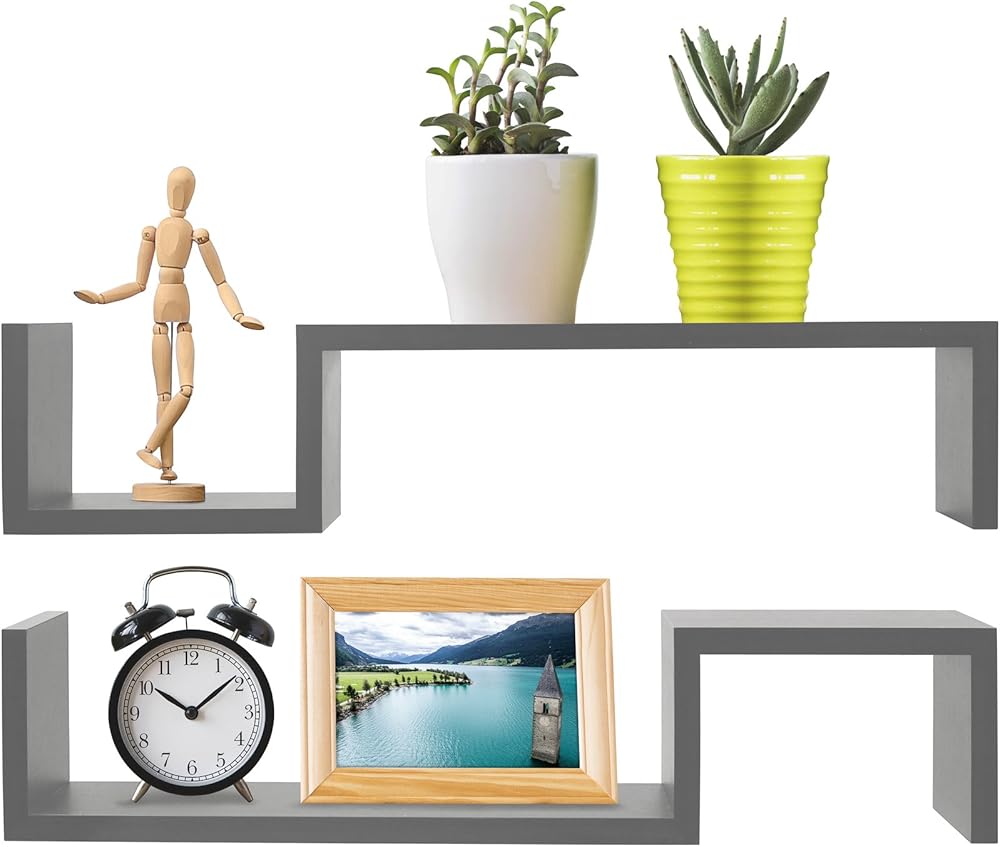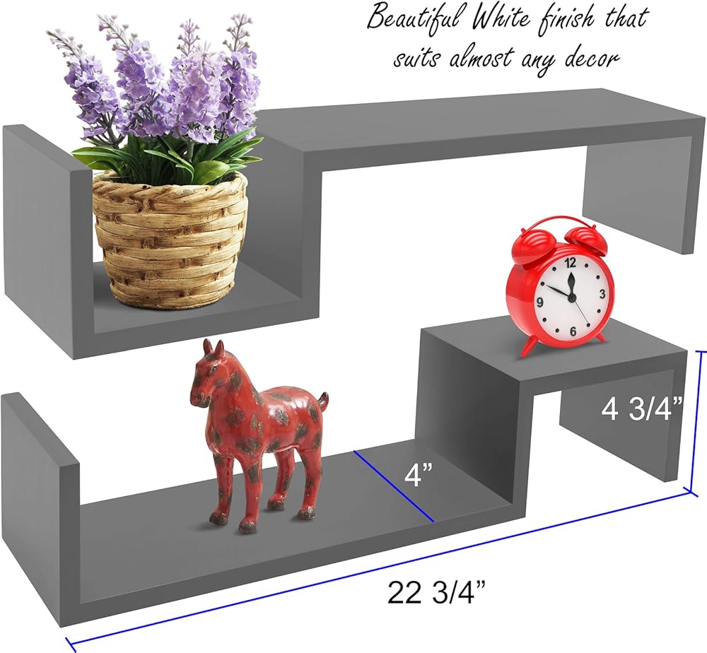 These S decorative floating shelves are functional and attractive alike. It suits almost every decor and is great for your kitchen, dining room, living room or office. Use it as a practical shelf or to display collectibles, photos etc. or decorative items. It's easy to mount and comes with all necessary mounting hardware. Shelf measurements in inches; 22.75" Long x 4.75 High x 4" Deep.