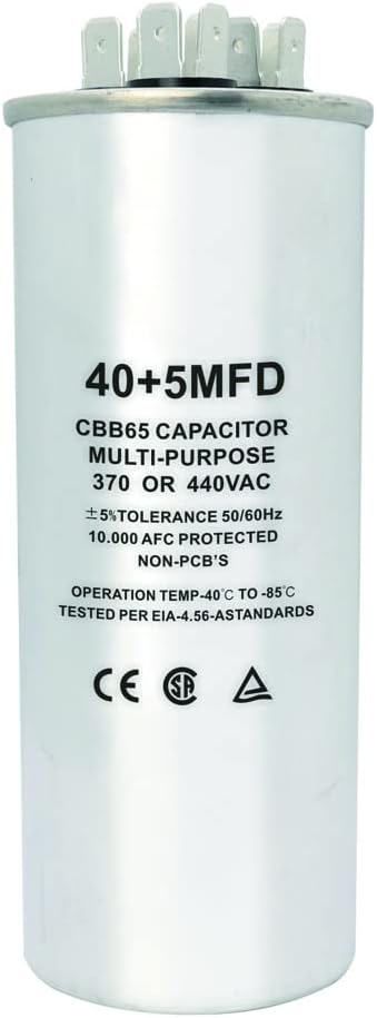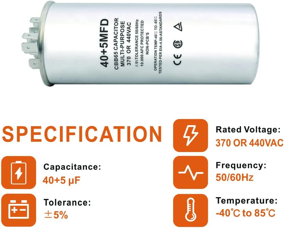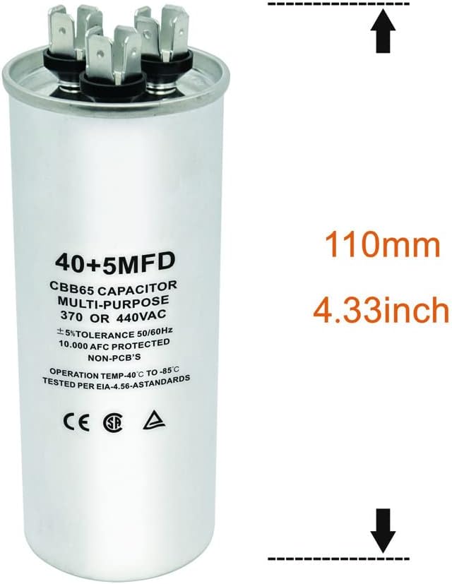 • Combination Capacitor: 45+5 MFD uf 370 or 440 Volt VAC Round Dual Run Capacitor.
