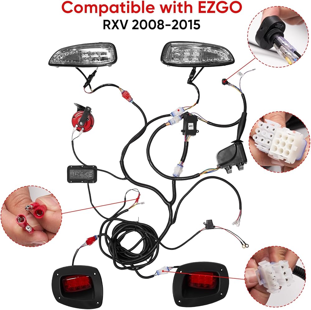 مجموعة مصابيح LED الأمامية والخلفية الفاخرة متوافقة مع EZGO RXV 2008-2015، مجموعة مصابيح عربة الجولف القانونية للشارع 12 فولت، تتضمن مفتاح إشارة الانعطاف، وسادة الفرامل، القرن