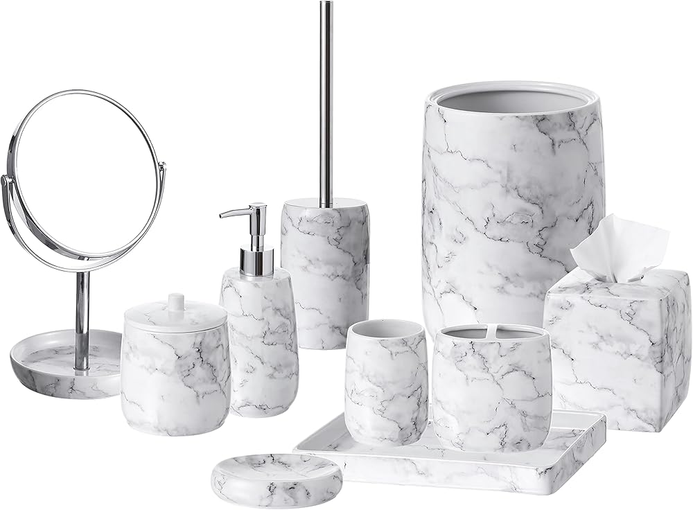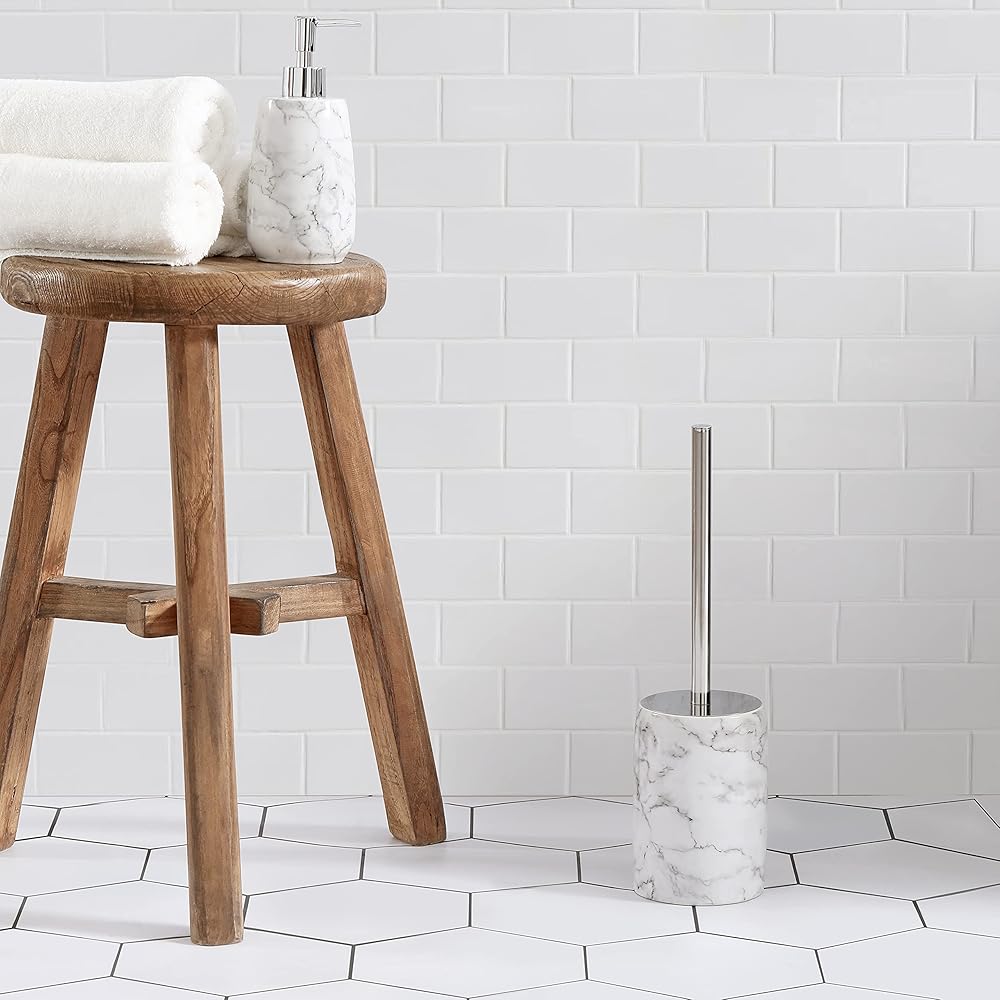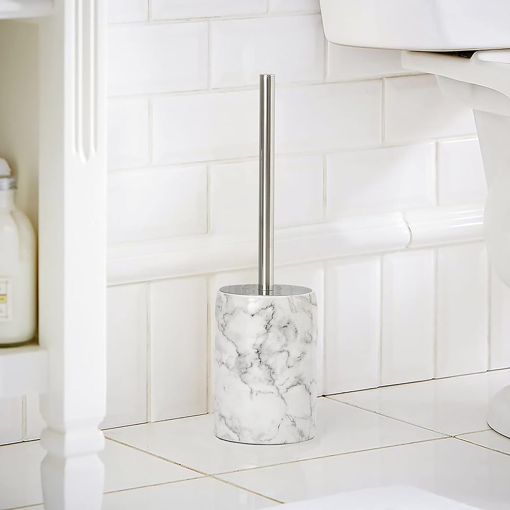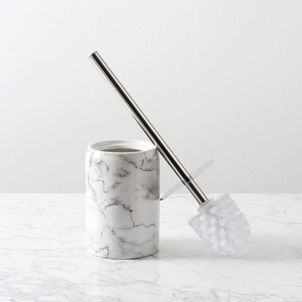 【Fashionable Storage】Toiler brush and holder set offers discreet storage to keep your floor dry and clean. Featured white marble look with elegant black veins makes it a luxurious and contemporary home décor. Rounded finish offers a smooth and delightful view to the eyes.