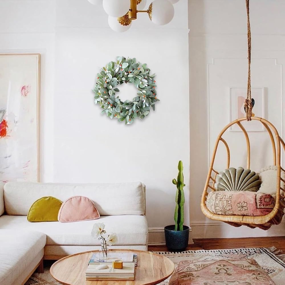 • [Green Leaves Front Door Wreath] Cute green lamb ears wreath evenly arranged on the base of the natural grapevine wreath circle, on the top layer of the wreath, lovely mini berries and white artificial plant added which is a eye-catching point for this front door wreath. This wreath is a good choice if you are seeking valuable home decor wreath.