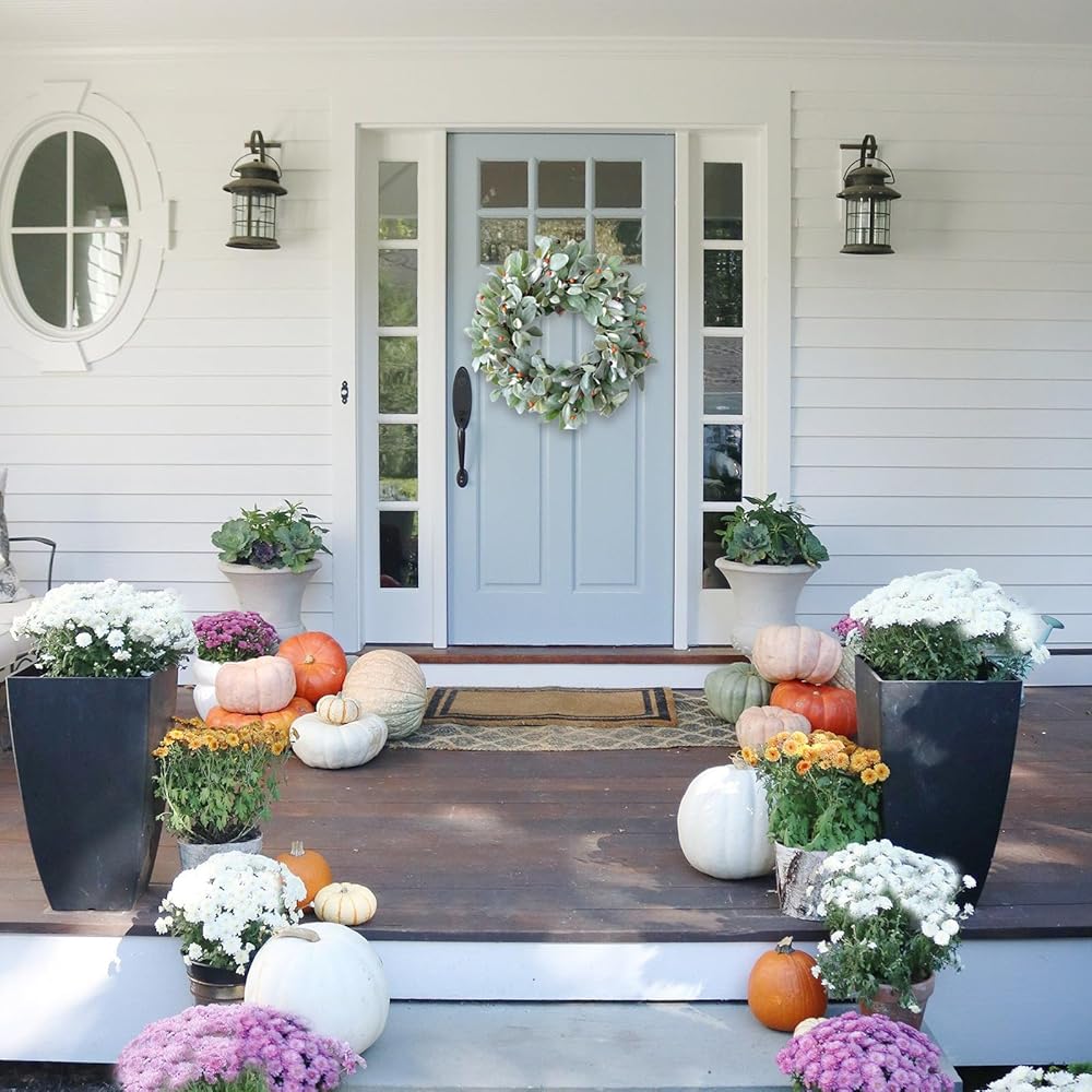 • [Fall And All The Year Round Decor Wreath] This fresh green color wreath can be hanged on for all the year round, and also we add some cute orange and brown color berries on the top, so this wreath also have a atmosphere of the fall and harvest, it will be a good choice for hanging on the coming season.