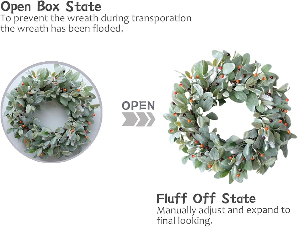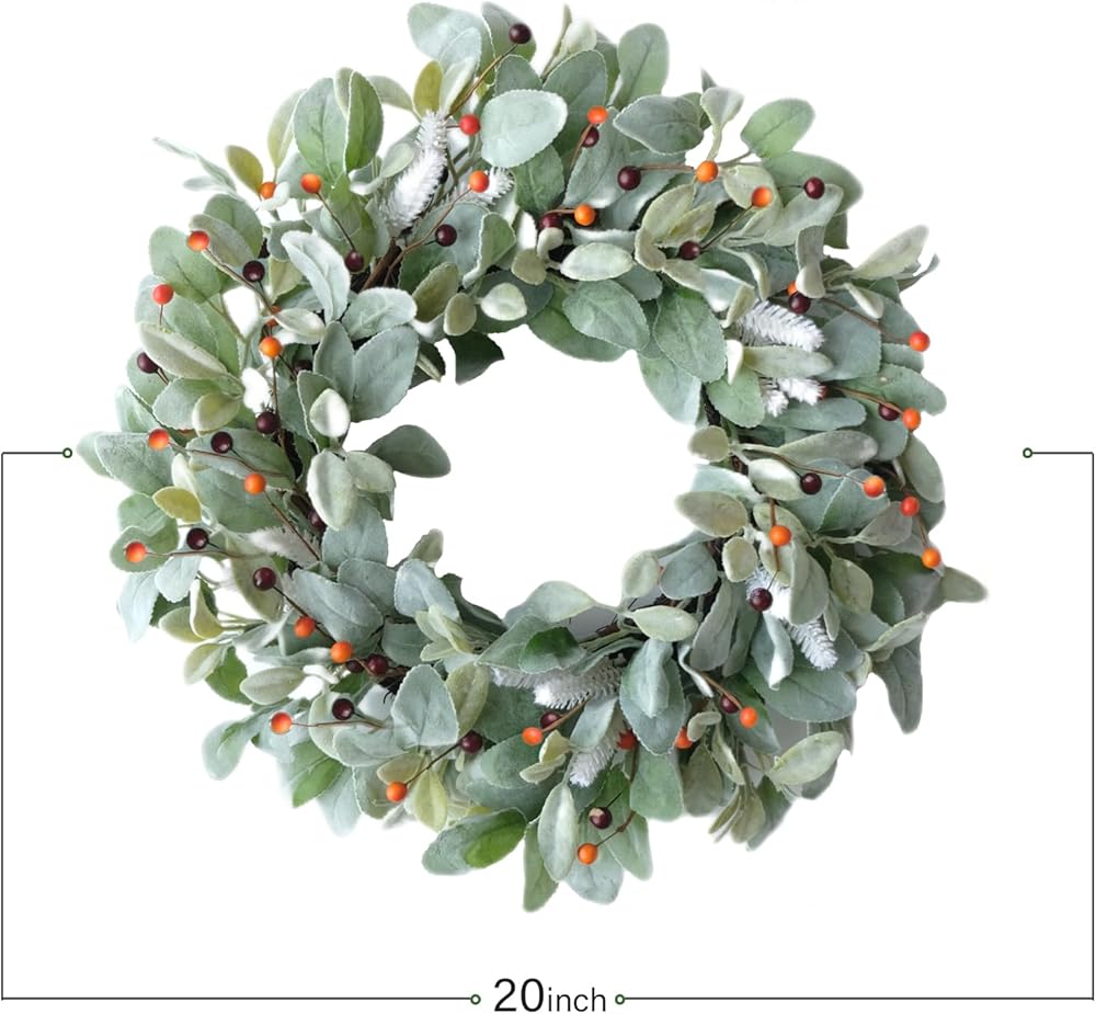 [Green Leaves Front Door Wreath] Cute green lamb ears wreath evenly arranged on the base of the natural grapevine wreath circle, on the top layer of the wreath, lovely mini berries and white artificial plant added which is a eye-catching point for this front door wreath. This wreath is a good choice if you are seeking valuable home decor wreath. [20 Inch Fall Leaves Berries Wreath] The outer diameter of this wreath after fluff off is about 20 inch, this size will be good for decorating your front door, porch doors, windows, kitchen, indoor doors and also you can decor your fence with this 20 inch leaves wreath. This wreath will come to you with a strong box, you can keep it for storage as well. [Fall And All The Year Round Decor Wreath] This fresh green color wreath can be hanged on for all the year round, and also we add some cute orange and brown color berries on the top, so this wreath also have a atmosphere of the fall and harvest, it will be a good choice for hanging on the coming season. [Rustic Farmhouse Window Kitchen Wreath] The style of this wreath is rustic and farmhouse, which makes the wreath easily match to all kinds of home decor, even your home is classical or modern style, this wreath can be well fitted in and add points for your whole house decoration. [Tips] 1.Fluff off the wreath to a perfect shape before hanging. 2.Please indoor use and covered outdoor use to keep the wreath long-lasting.
