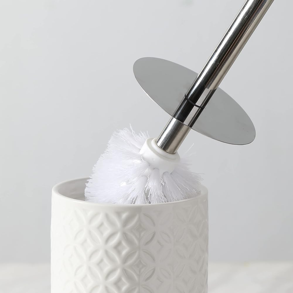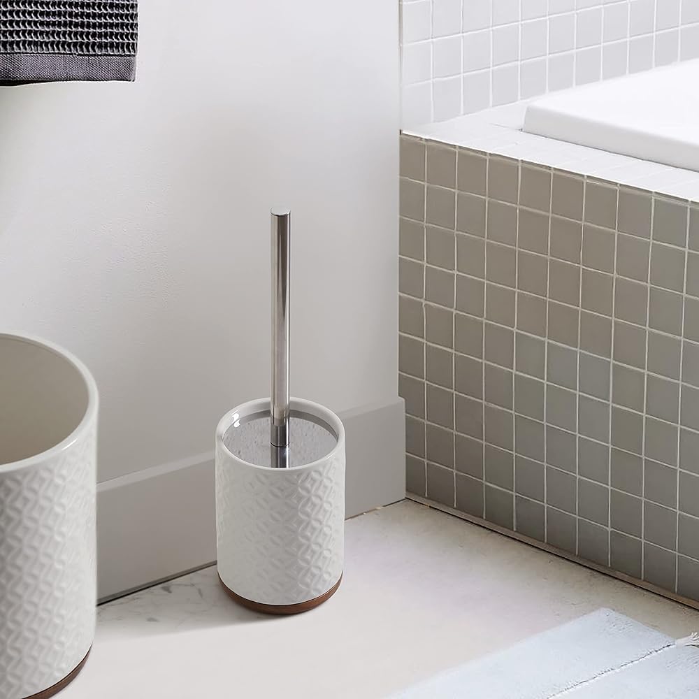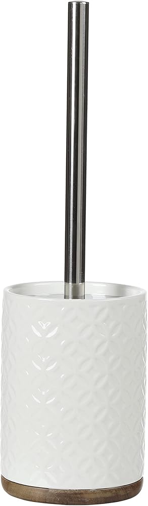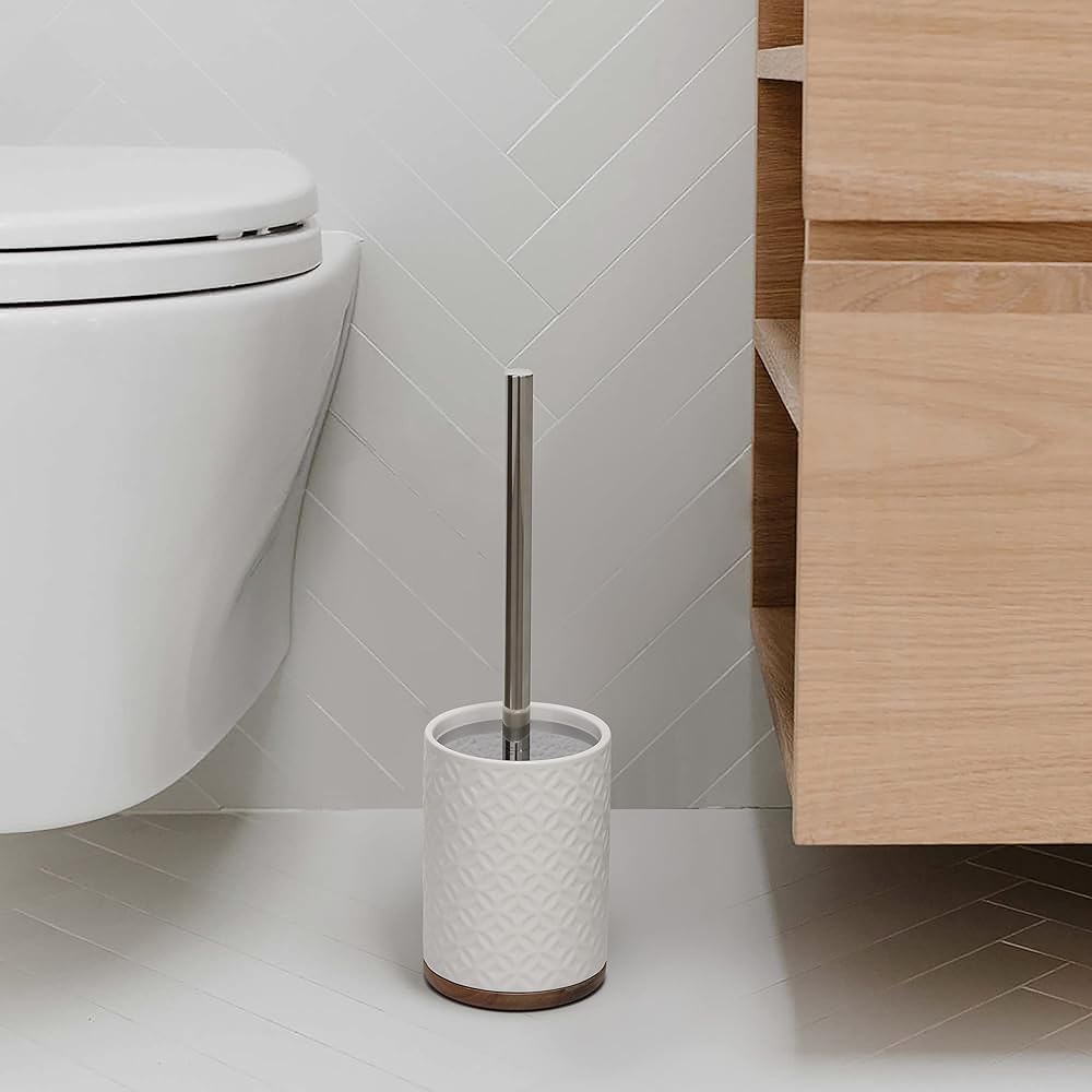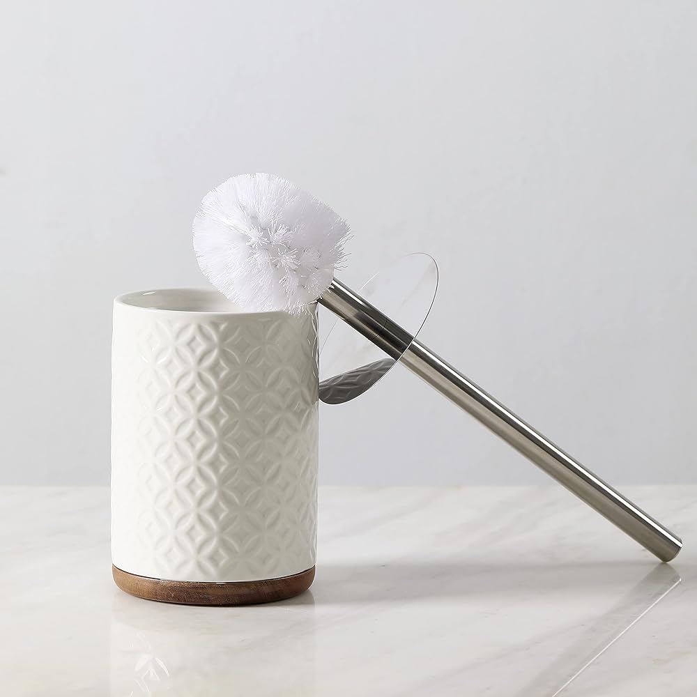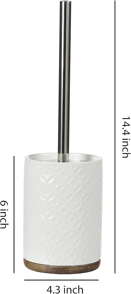 • 【Fashionable Storage】Toiler brush and holder set offers discreet storage to keep your floor dry and clean. Featured glossy finish with white embossed patterned body and wooden base makes it a luxurious and classic home décor. Rounded finish offers a smooth and delightful view to the eyes.