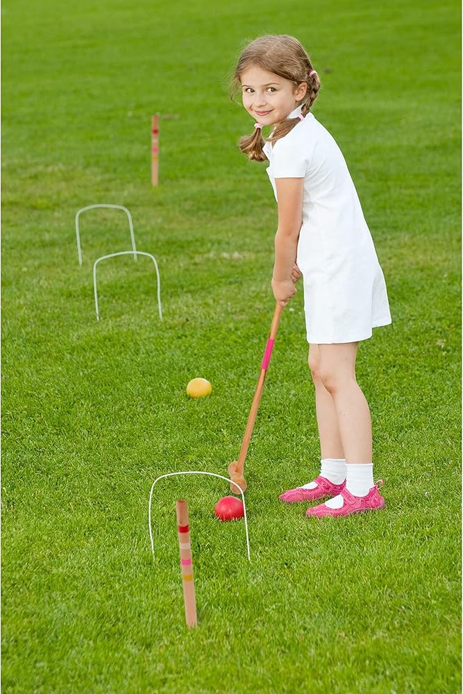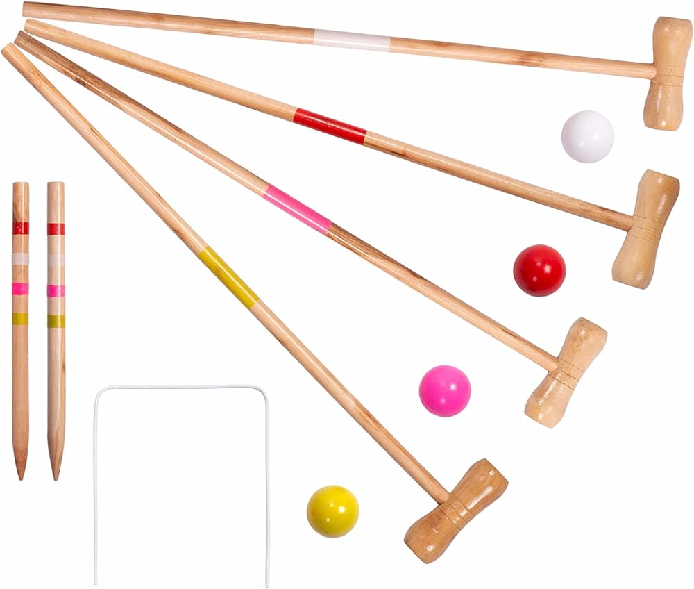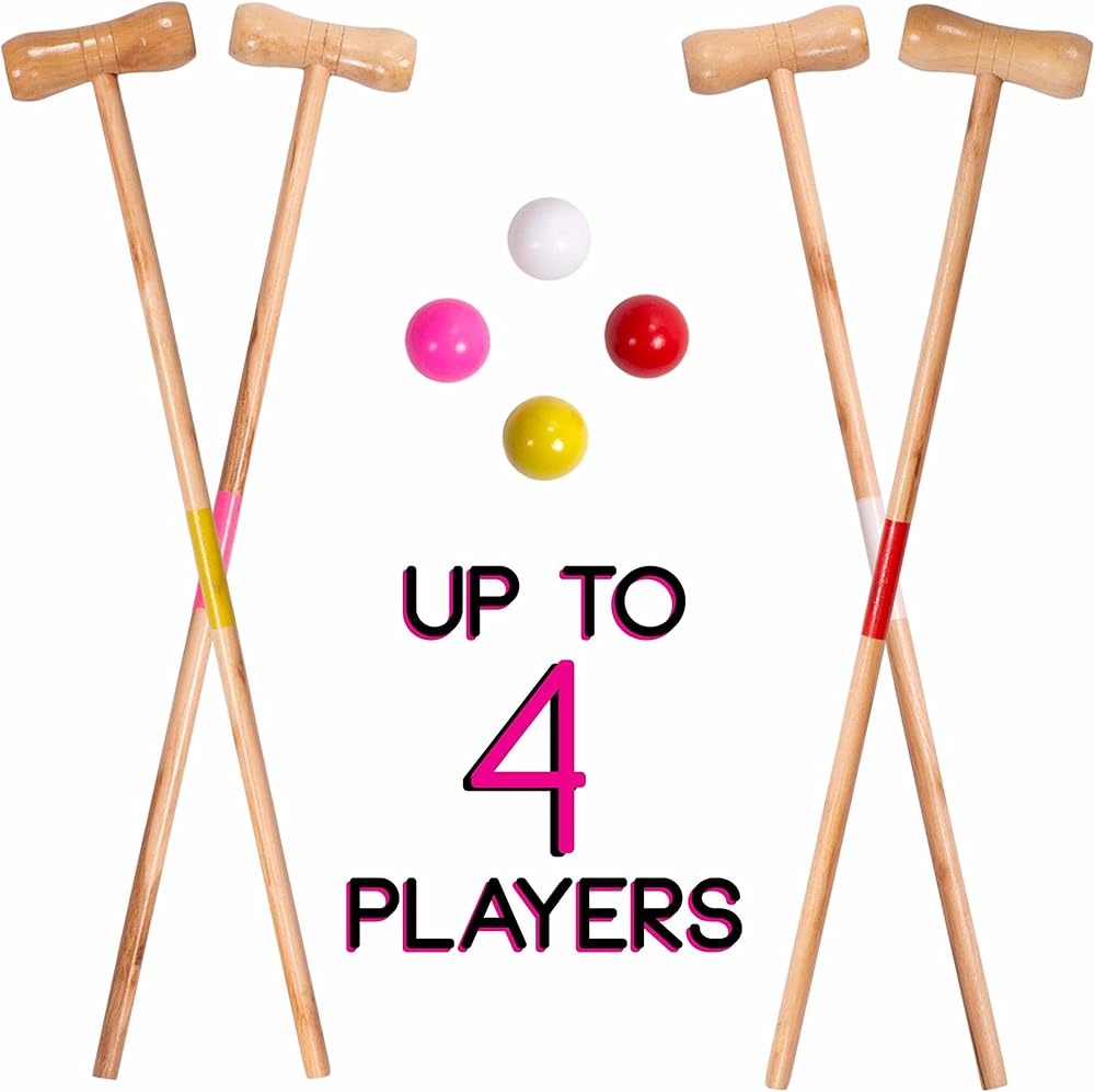 مجموعة كروكيت للأطفال لأربعة لاعبين | لعبة كلاسيكية في الحديقة الخارجية للأطفال | رائعة لحفلات أعياد الميلاد والنزهات وحفلات الشواء والمزيد | تأتي مع مطارق وكرات وويكيت وحقيبة حمل لسهولة النقل