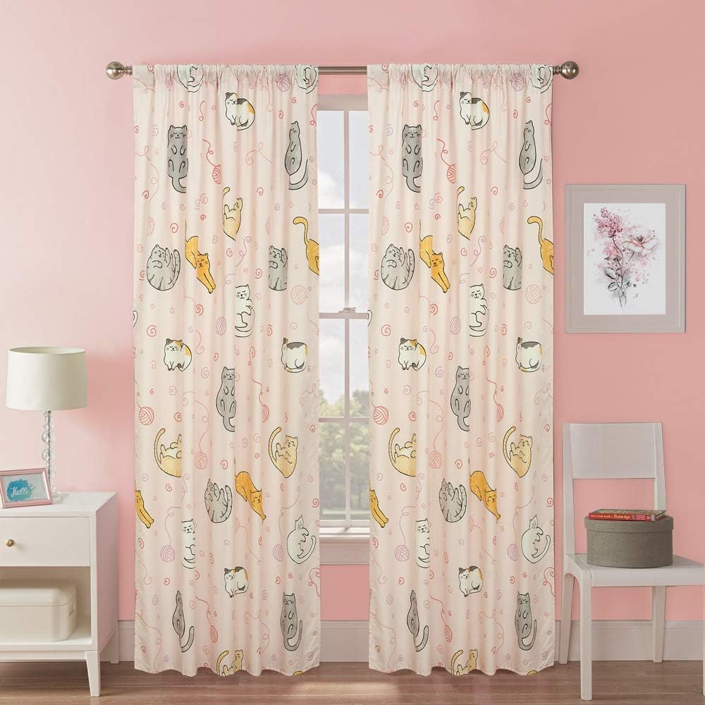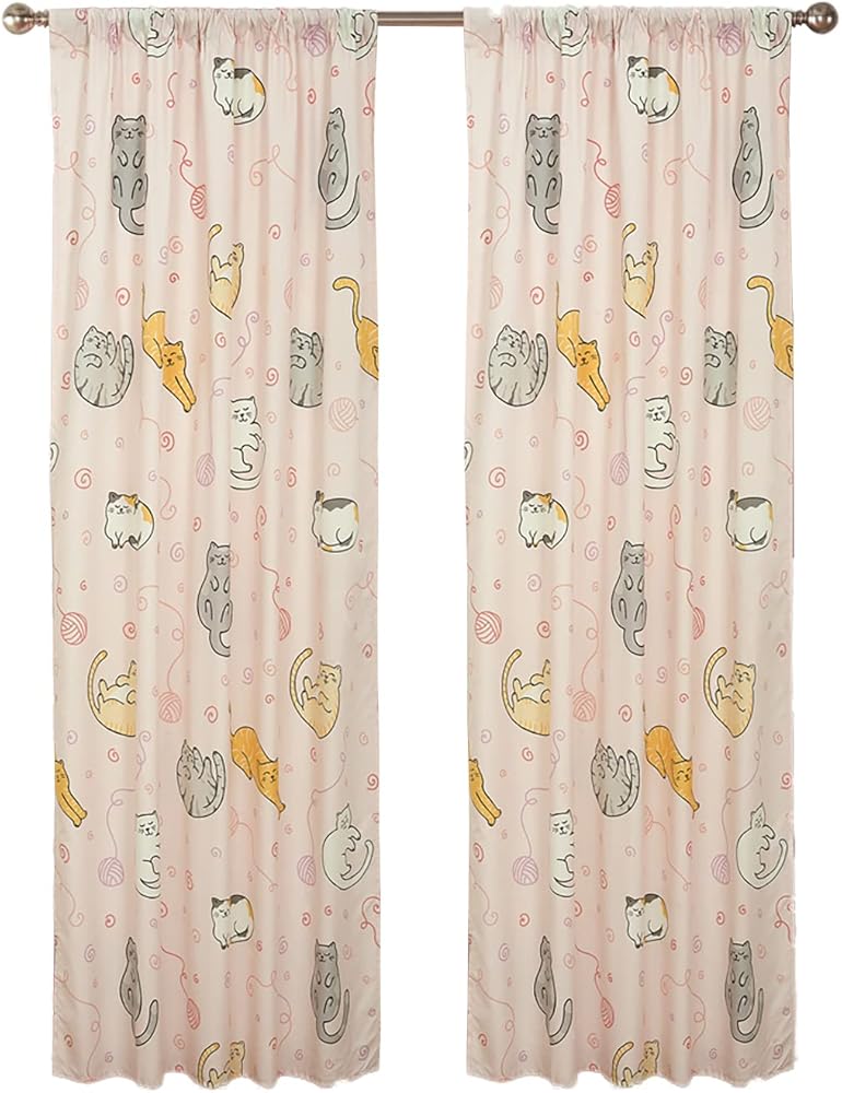 "Sleepy Cats Window Treatments These Window Curtains are designed to be fun and get your child excited to be in their room. Bring these sweet, sleeping cats into your child's bedroom with our Sleepy Cats window curtains. Your little cat lover will love going to sleep looking at these super cute cat and yarn print curtains with grey, white and tan cats and pink and purple yarn on a soft pink ground. These microfiber curtains are durable and can hold up to any child's everyday use for years to come Benefits: Polyester Microfiber construction for softness and durability 3” top rod pocket fits up to 2½” wide curtain rod Affordable prices that fit any budget, without sacrificing quality Beautiful colors to complement your child's room Perfect Fit Sizing: Panels: 2 - 48" x 84" Panels with 3” rod pocket Easy Care: Machine wash and dry, fade resistant, wrinkle resistant and pill resistant 100. : If you do not absolutely love this bed in a bag, return them within 30 days for a full refund. We will work with you to resolve any issue and ensure that you are satisfied with your experience"