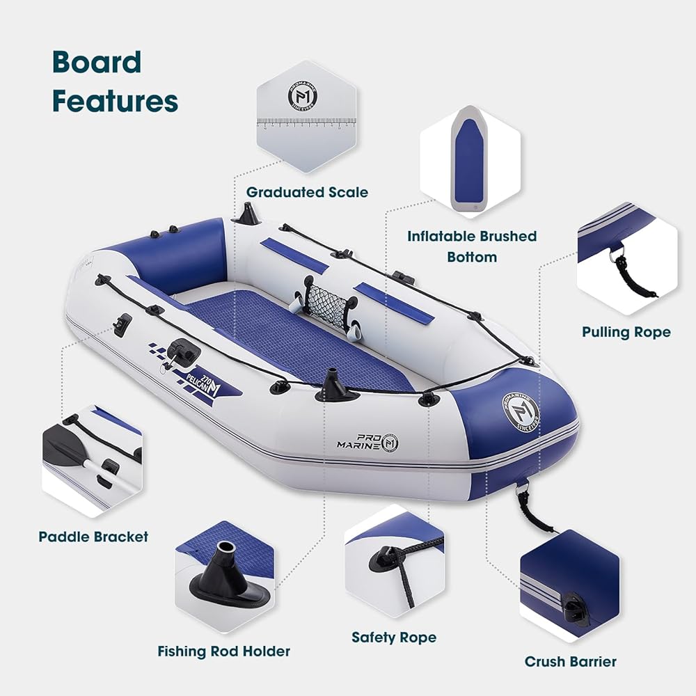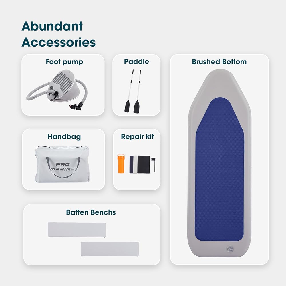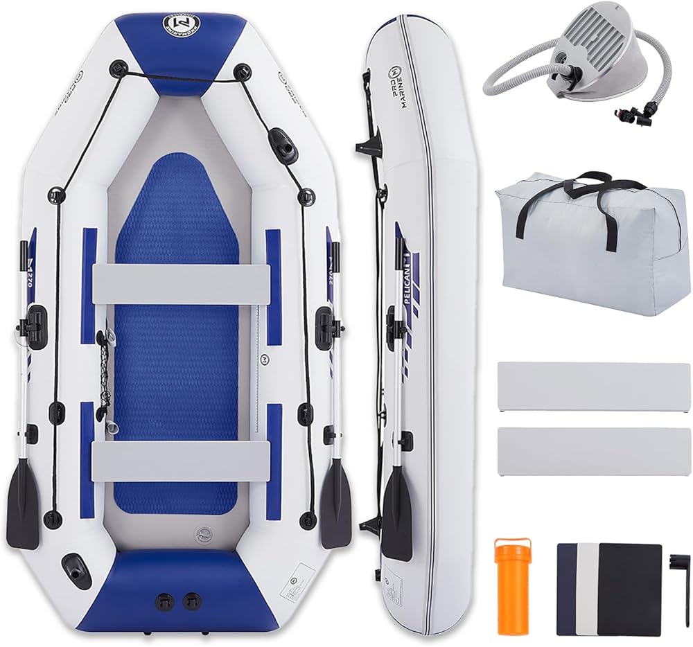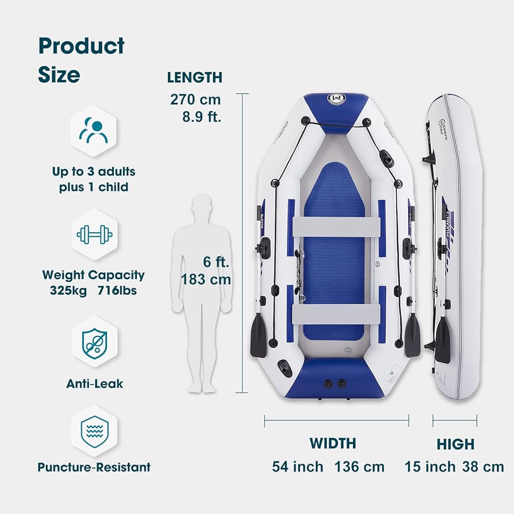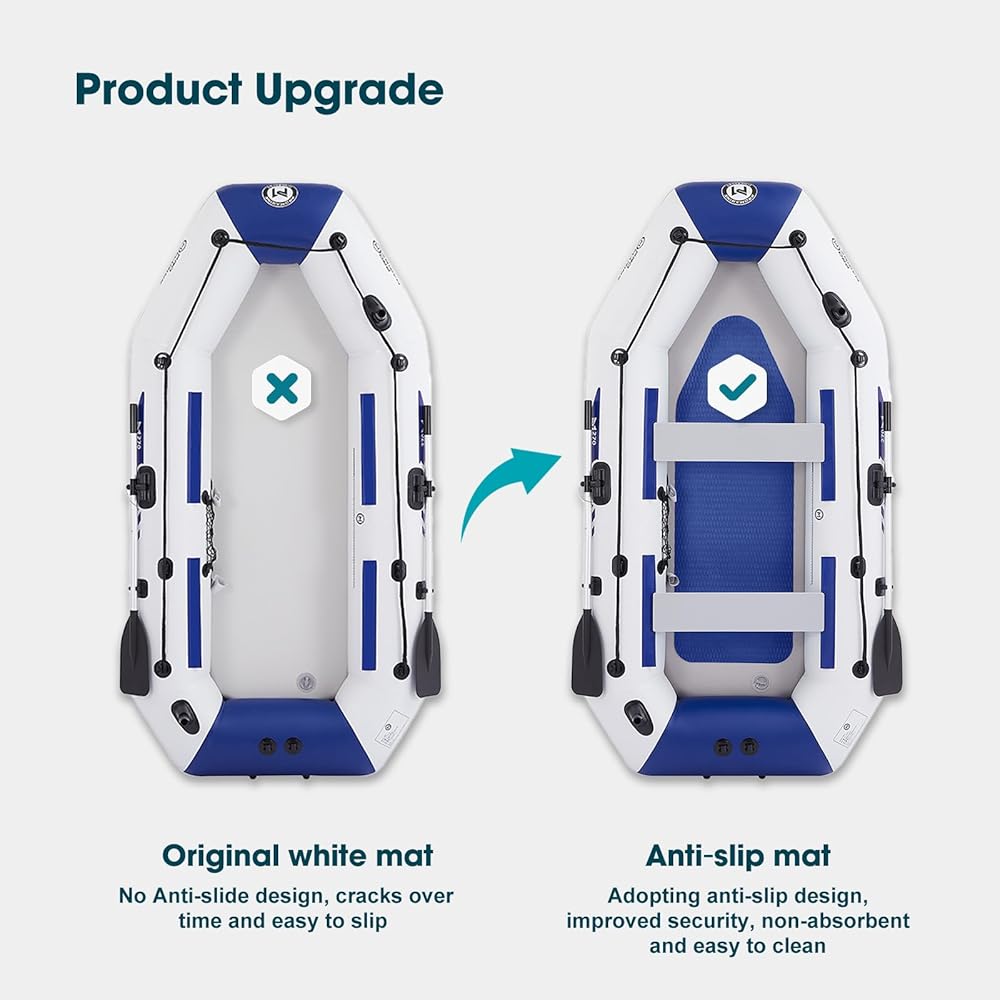 • Deluxe Package- An inflatable boat with weight capacity of 518lbs,2 aluminum oars, 2 removable seats, anti-slip mats, portable foot pump, portable bag.