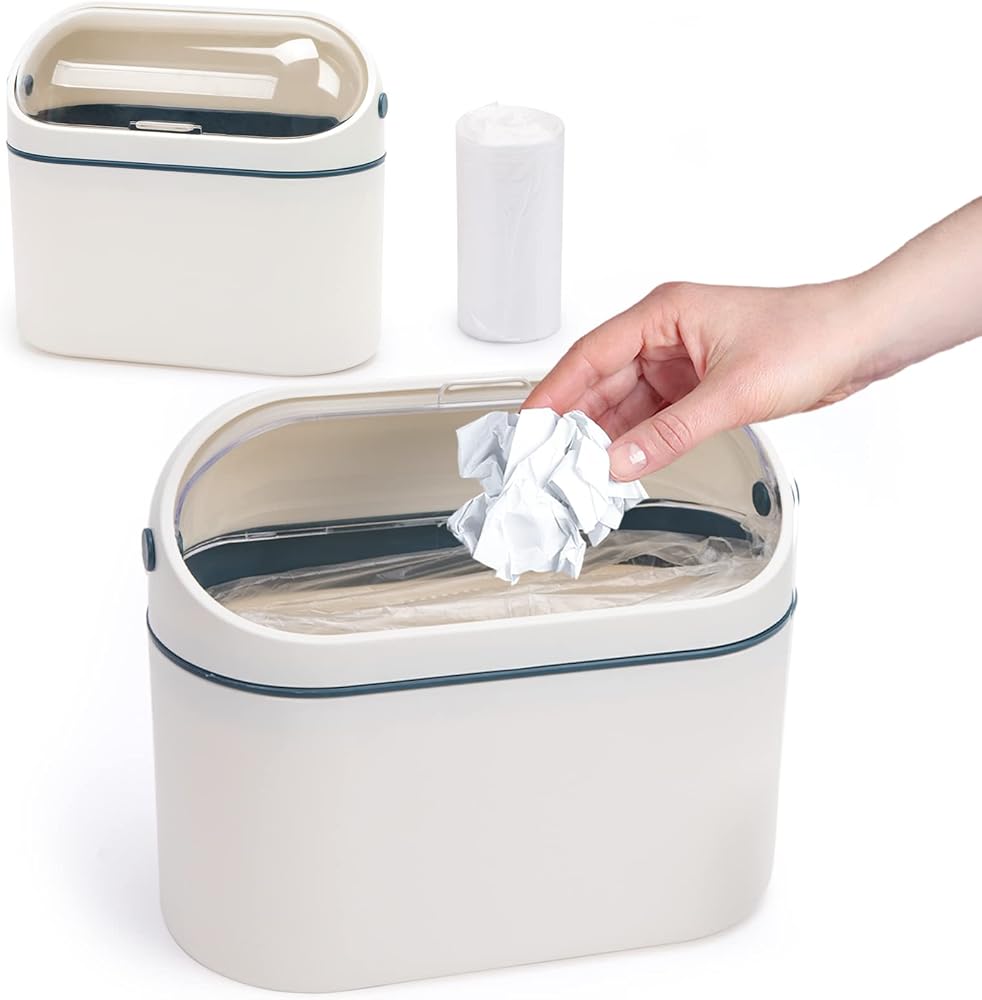 • تصميم بغطاء شفاف ومشطوف - سلة المهملات هذه مناسبة لورق المهملات، والكرات القطنية، ومسحات القطن، وإسفنجات المكياج، وأنسجة الوجه، والدوائر القطنية. غطاء سلة المهملات سهل الفتح والإغلاق، مما يمنع الرائحة الكريهة والذباب بشكل فعال. فتحة مائلة كبيرة تسمح لك بوضع القمامة بسهولة.