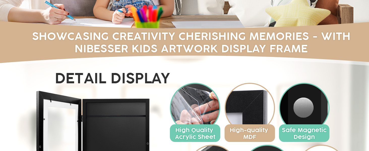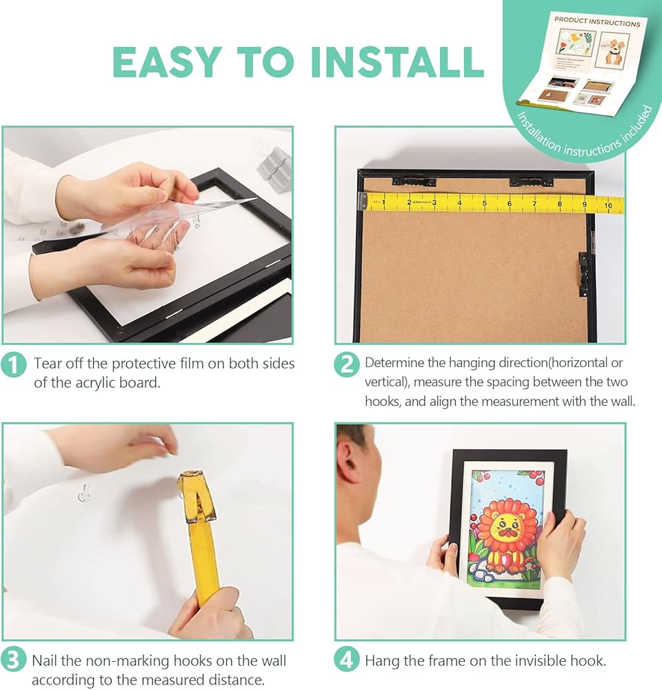 • 🎨 سهلة الاستخدام: تأتي إطارات العرض الفنية للأطفال من NIBESSER بتصميم مشبك مغناطيسي ومفصلات معدنية مفتوحة بزاوية 180 درجة، مما يجعلها سهلة الفتح والإغلاق. يمكنك بسهولة استبدال الصور مباشرة من الإطارات الفنية المثبتة على الحائط.