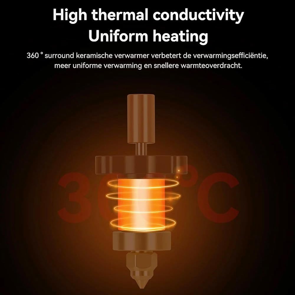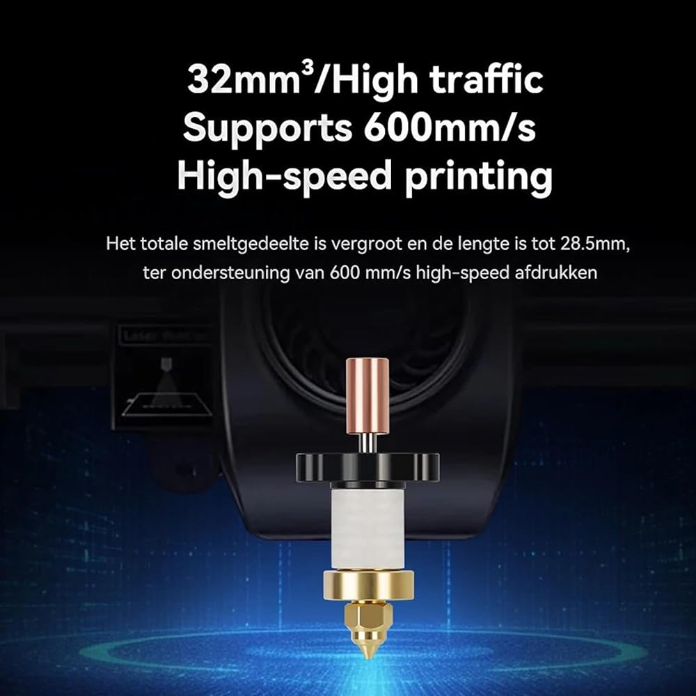 60W ceramic heating ring, faster and more uniform heating, faster heat transfer, and large melt section of the heating ring supports up to 600mm/s high-speed printing.