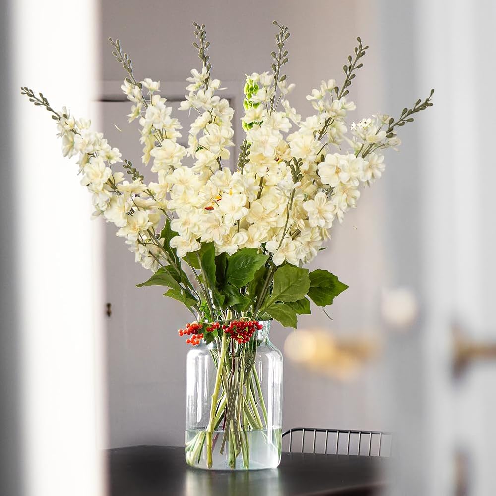 Material: Artificial fake larkspur looks real and natural. The petals are made of high-quality silk material, The stem part is made of wire, wrapped inside, It can be easily bent or cut according to needs, suitable for placing in vases of different heights.