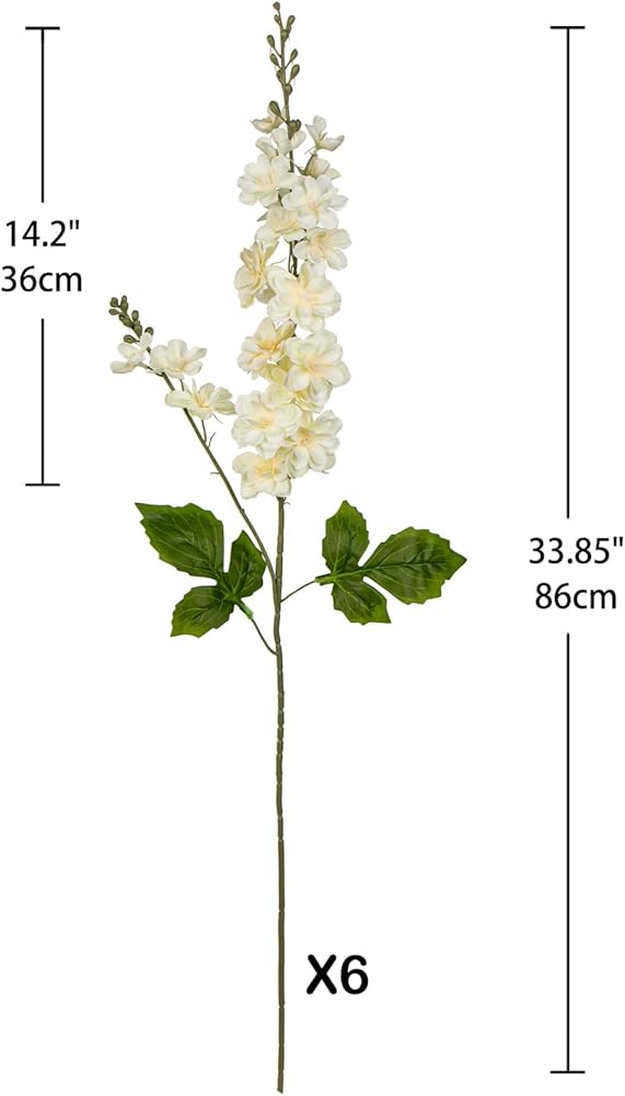 Size: Delphinium artificial flower is about 17inches,total 20pcs flower heads in one stem, flower heads approx 2'' in diameter,packing include 6pcs Delphinium stem.The stem can be bent and adjusted.