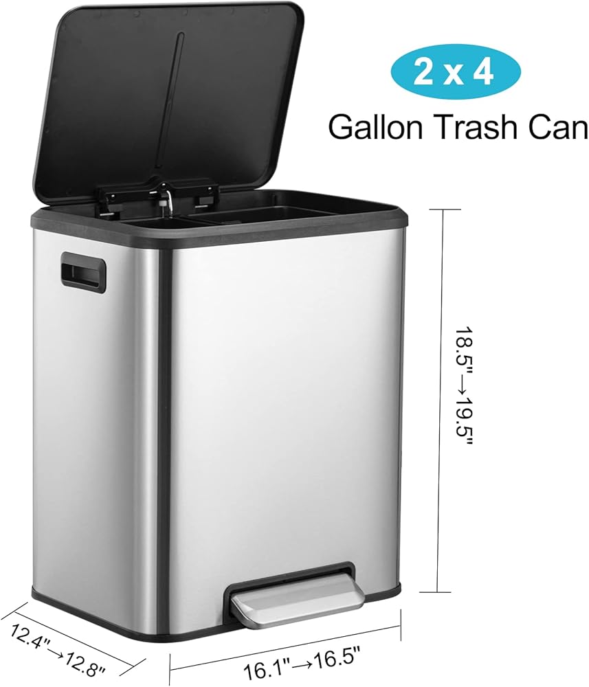 • [Dual Compartment Bins]: The garbage can has two 15-liter (4-gallon) inner buckets. Take the pain out of recycling by sorting your waste and recycling materials in one location with separate bins for you.