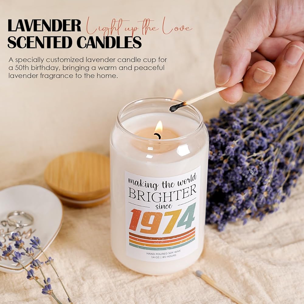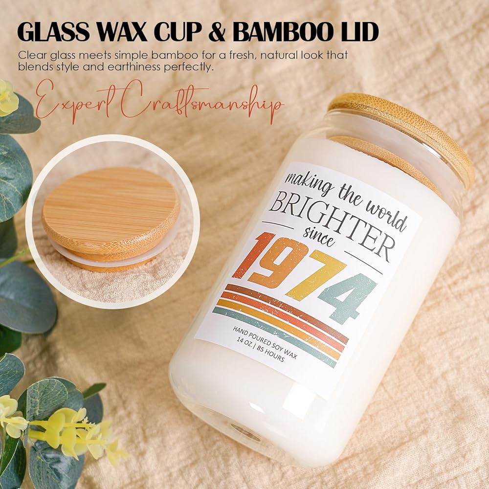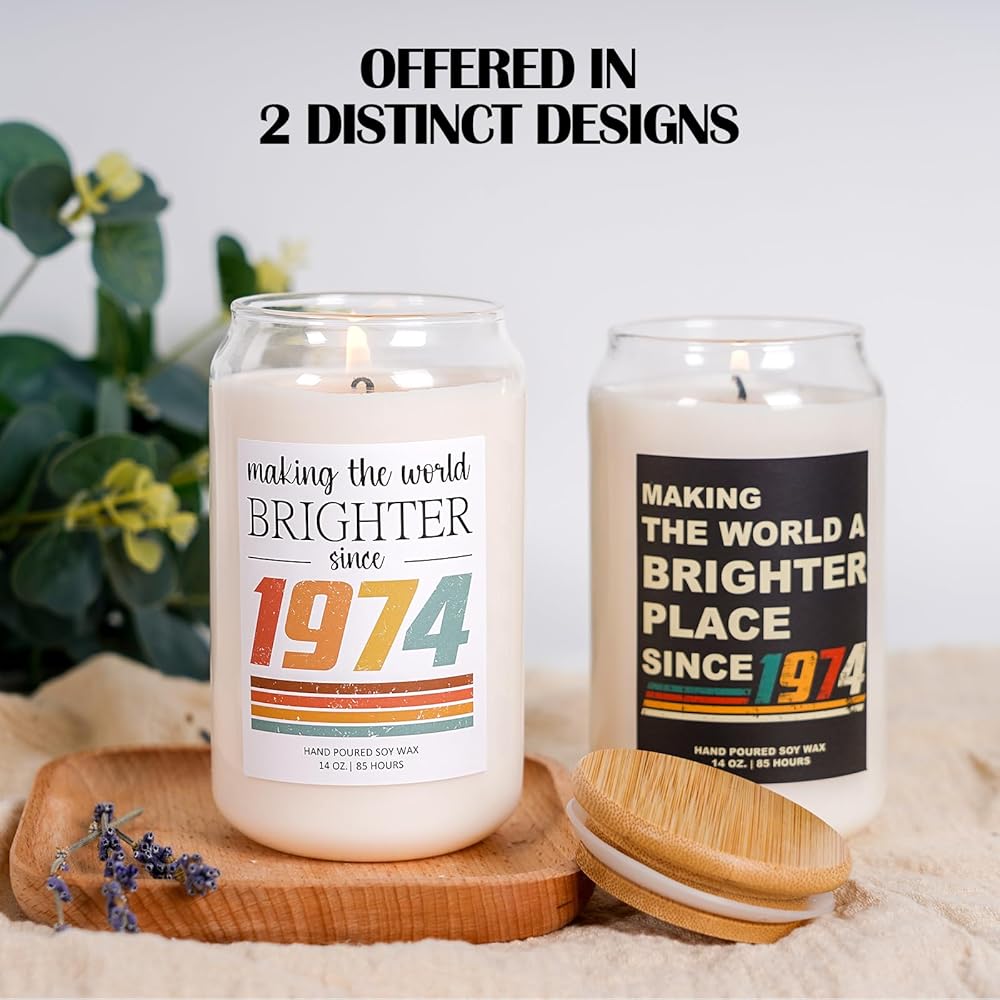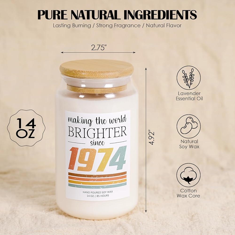 High-Quality Gift: Our 1974 candle comes in a sleek and convenient gift packaging, eliminating the need for additional wrapping. Featuring a beautiful 14oz glass jar, measuring 2.75 by 4.92 inches, and boasting an impressive 85-hour burn time, it promises long-lasting enjoyment.