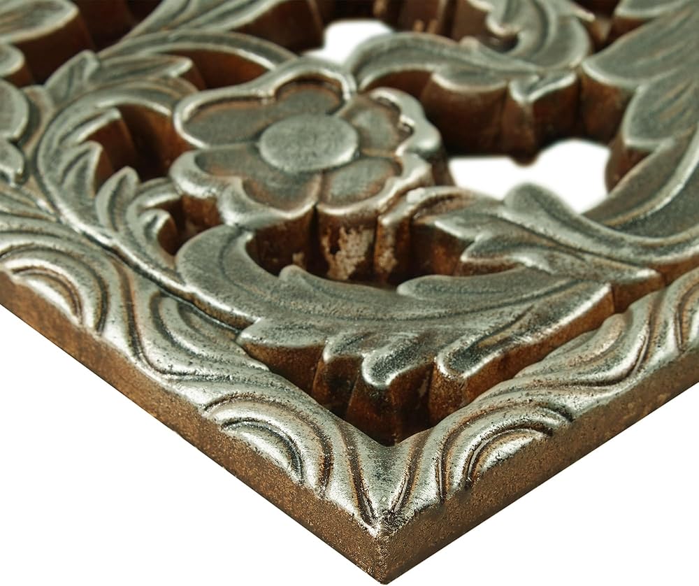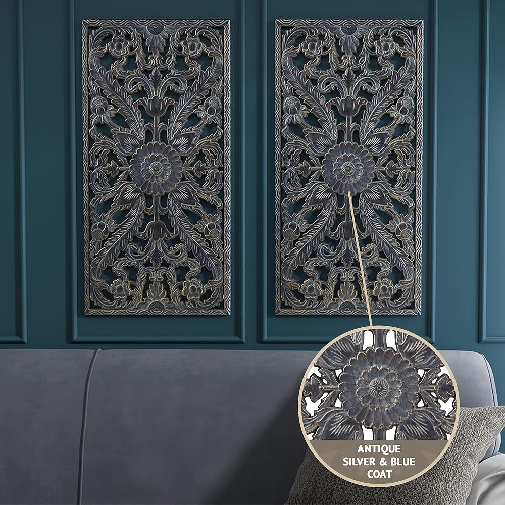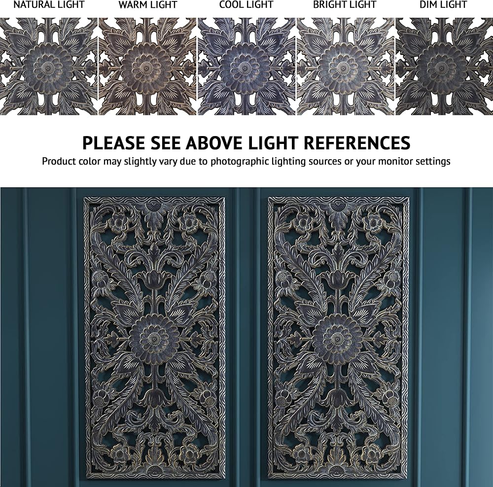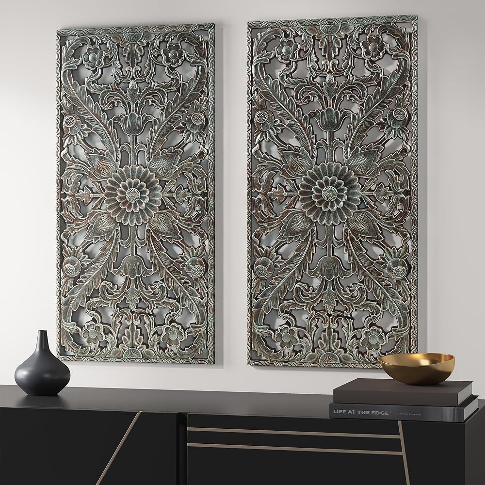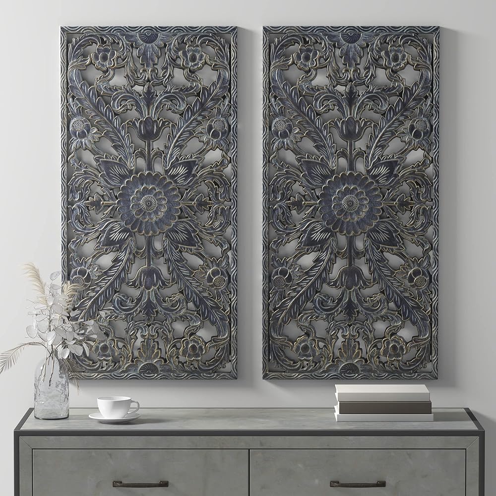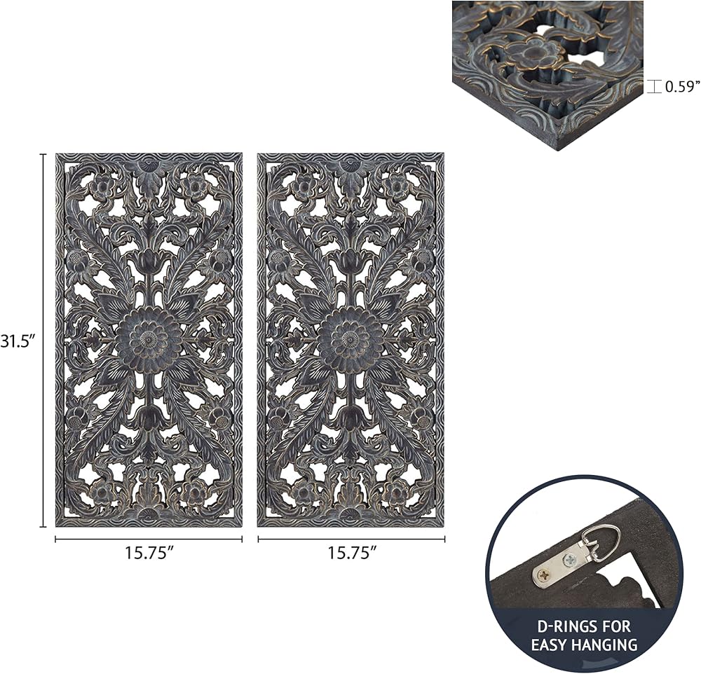 This two piece wall panel set features elegantly carved global inspired designs on MDF that create beautiful texture and dimension.