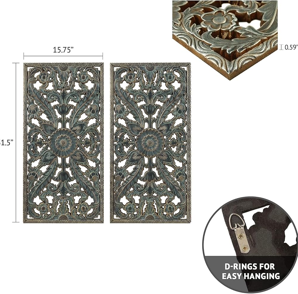 Complete your home decor with our Madison Park Botanical Panel Distressed Carved Wood 2-piece Wall Decor Set. This wall decor set features exquisite carved global botanical designs in a durable MDF material creating beautiful texture and dimension, while a white washed finish adds a unique vintage touch. Each piece is finished with two D-rings on the reverse making it easy to hang pieces, either side by side for a more clean look or staggered for a more stylized approach. Perfect for any Living Room, Dining Room, or Entry way - this carved wood panel 2 piece set is the perfect elegant touch to any decor.