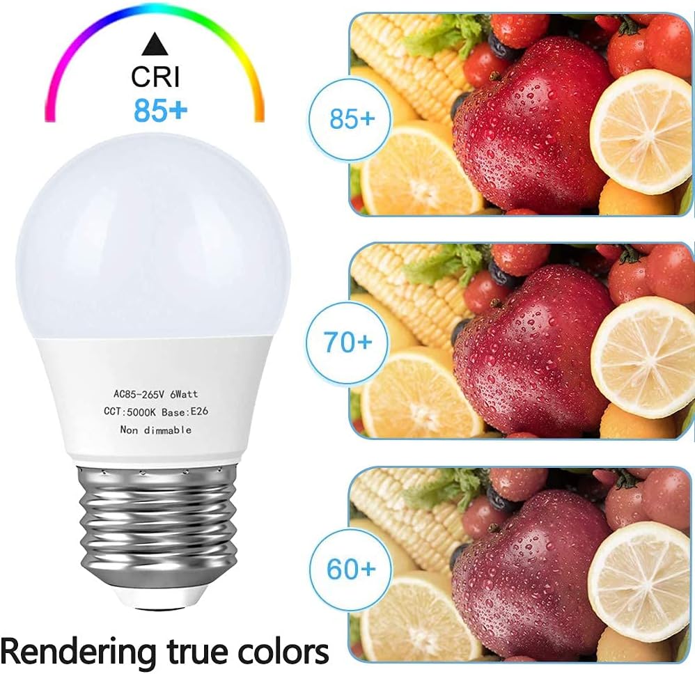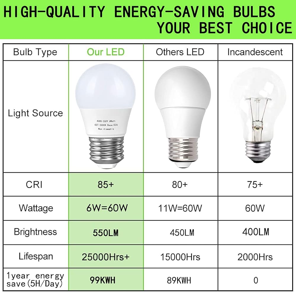 • 【Energy saving】A15 6 watt led bulb replace the traditional 40 watt 60 watt Incandescent lamp, consuming only 10% of energy, provides 550 lumens of light output, save up to 90% on your energy bill. Note: It cannot be used in refrigerator and bathroom