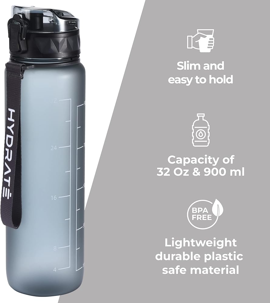زجاجة مياه تحفيزية من هيدريت - زجاجة مياه للتمرين سعة 12 أونصة مع ختم زمني - زجاجة شرب واسعة الفم مع حزام معصم - حاوية مياه بلاستيكية لصالة الألعاب الرياضية أو المكتب أو الرياضات الخارجية - أسود