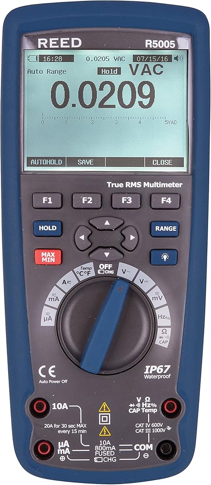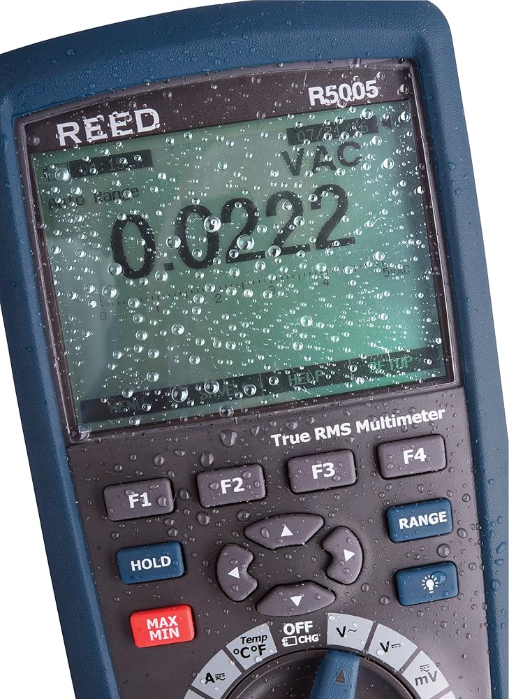 The REED TRMS Multimeter measures AC and DC voltage and current, resistance, capacitance, frequency and duty cycle measurements. It has a 10MHz frequency counter, temperature measurement capability and TRMS AC Voltage and Current measurements. The meter stores up to 10,000 recorded events and logs multiple sessions or it logs data continuously for over 200 hours. The 0,000-count graphical LCD with backlight displays multiple sets of measurement data simultaneously. It is Bluetooth enabled and IP67 rated waterproof.