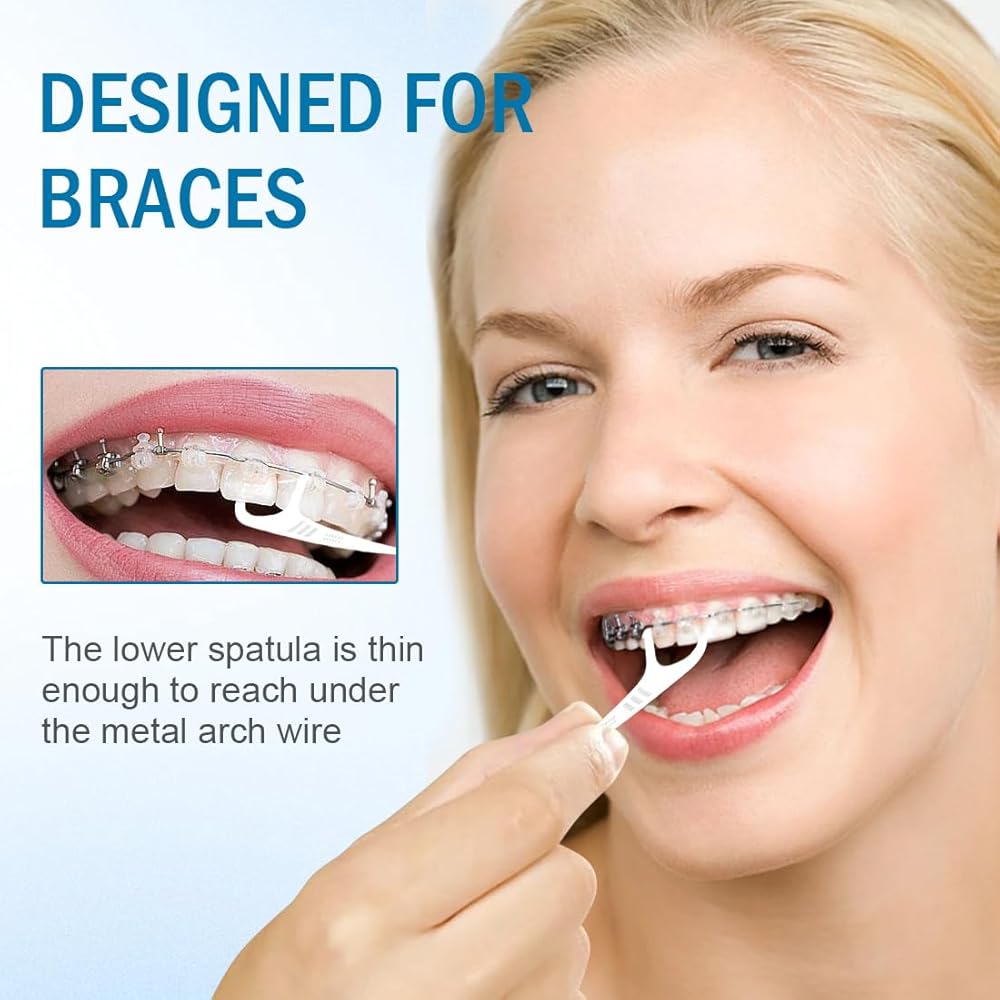 طرف عود الأسنان: تم تصميم طرف عود الأسنان لتنظيف بقايا الطعام الصغيرة حول السلك المعدني للتقويم، والحفاظ على نظافة التقويم، ومنع بقع الأسنان، ورائحة الفم الكريهة، ومشاكل الفم الأخرى.