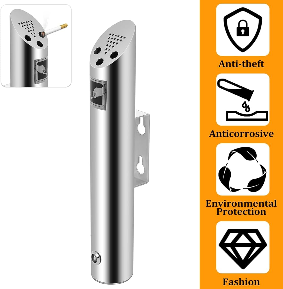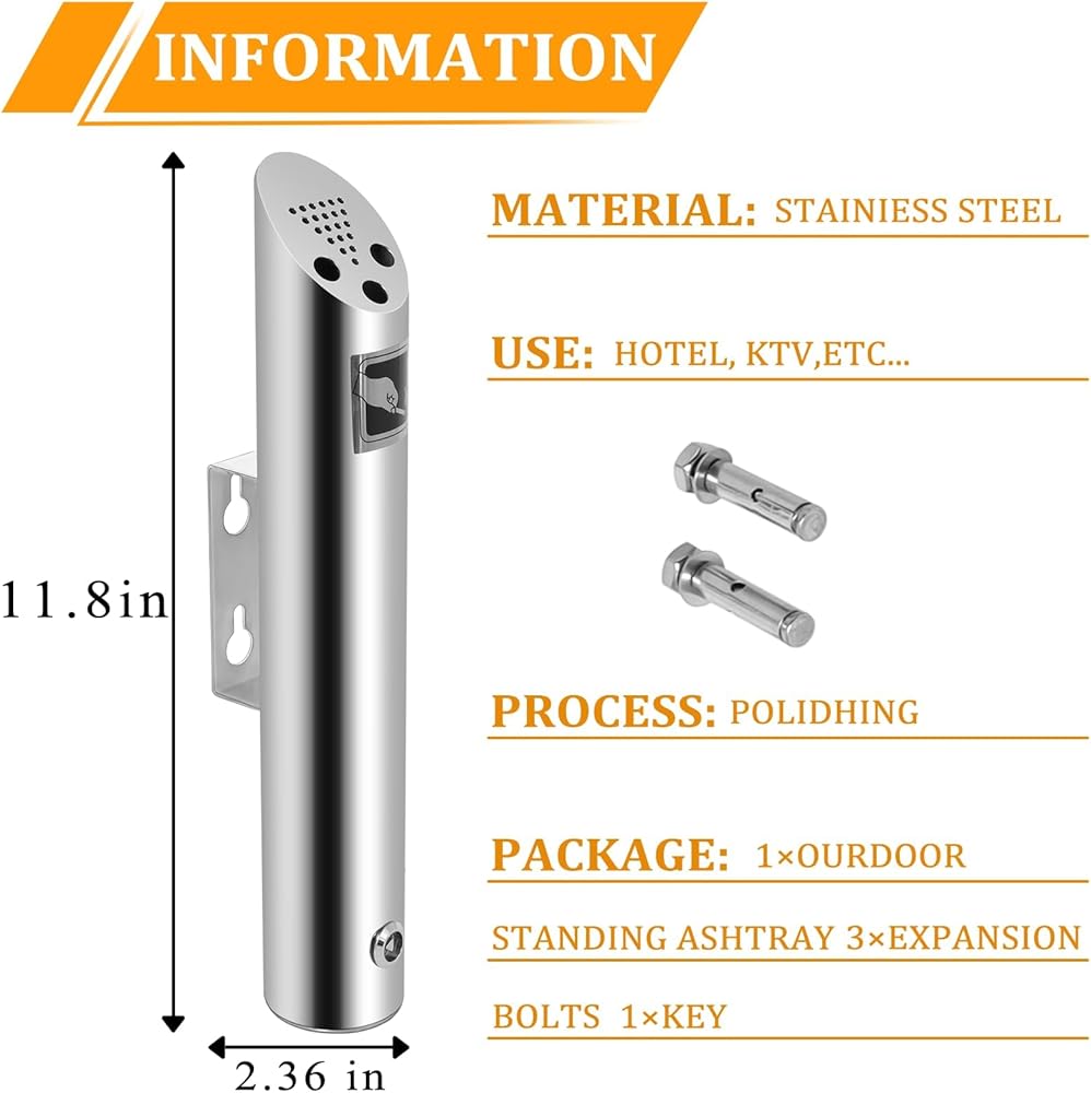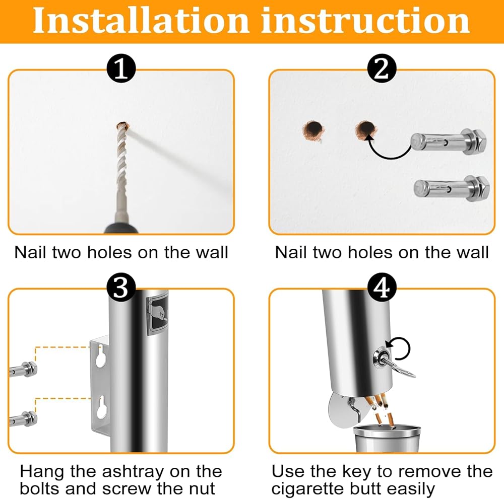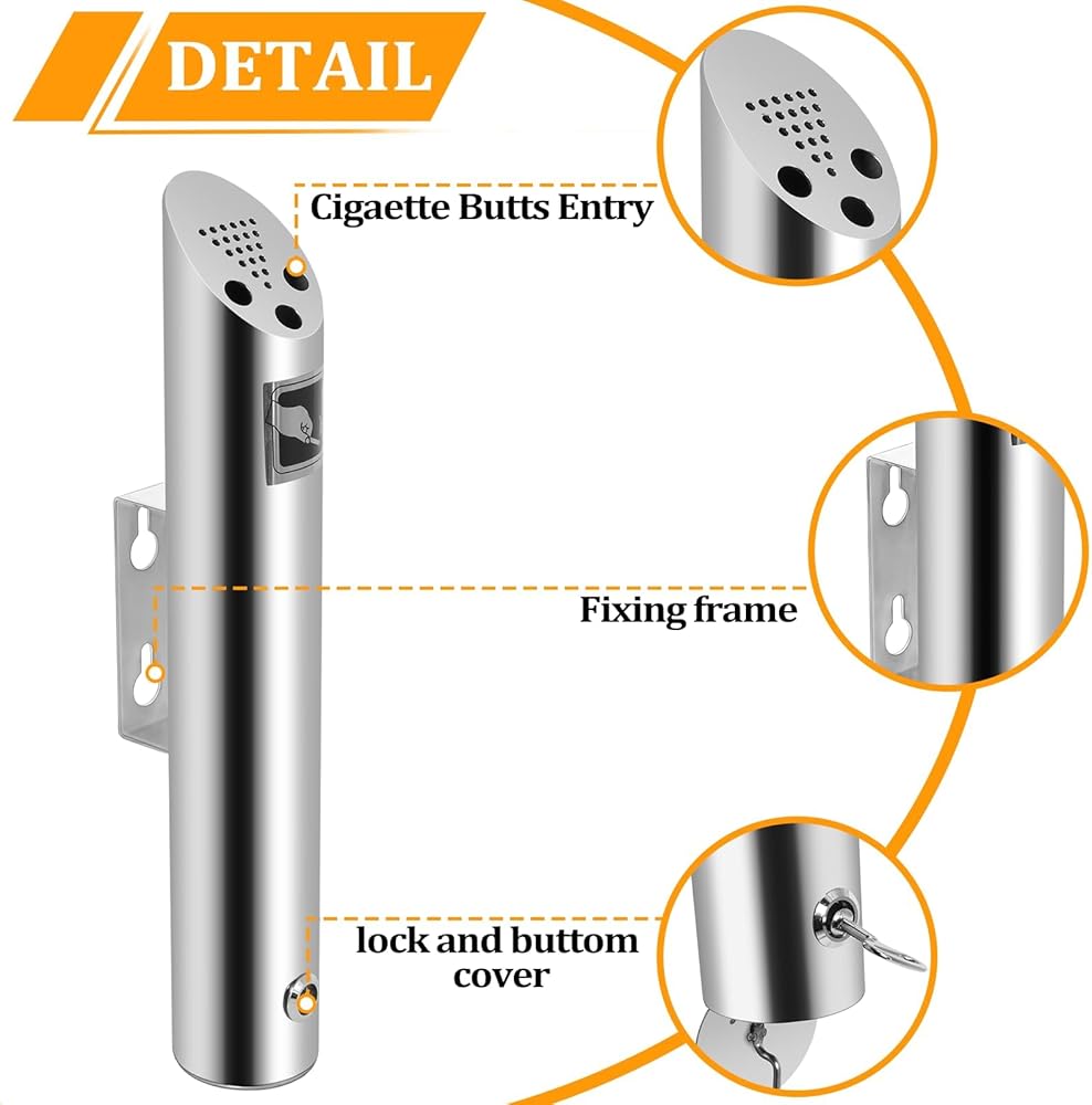 【EASY TO INSTALL】Wall mounted design is easy to install. Easy cigarette butt removal by simply unlocking the bottom cover with the included key; No need to unscrew receptacle.