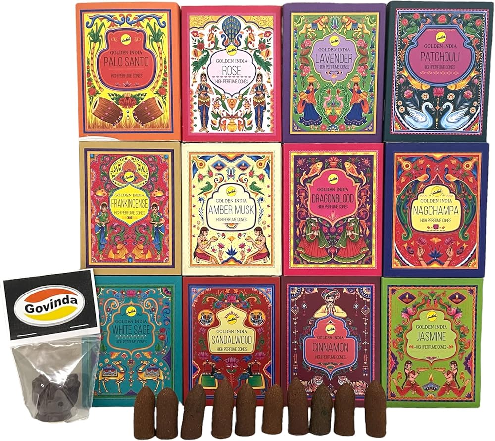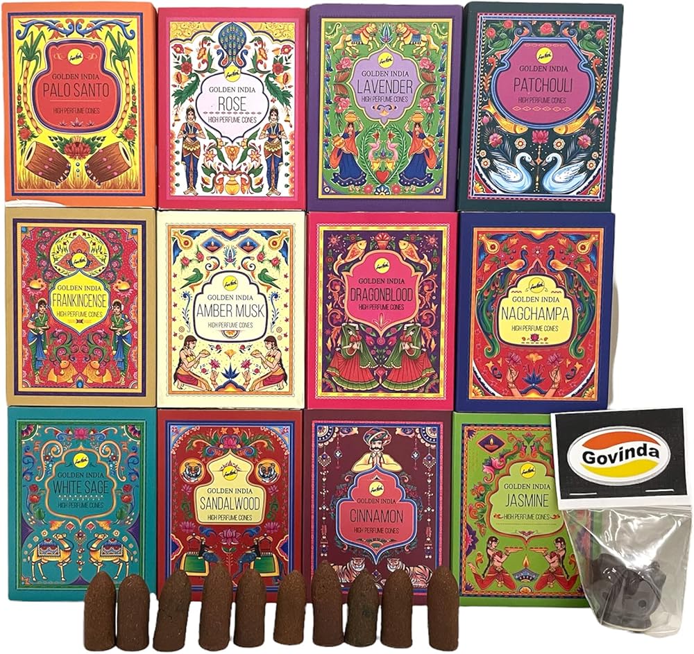 مجموعة متنوعة من مخاريط بخور سريفاني ذات الرائحة العالية من أجل الشلال العطري ونافورة الدخان وشلالات الضباب وحزمة مبخرة اللوتس - 12 عبوة إجمالي 120 قطعة من 12 عطرًا