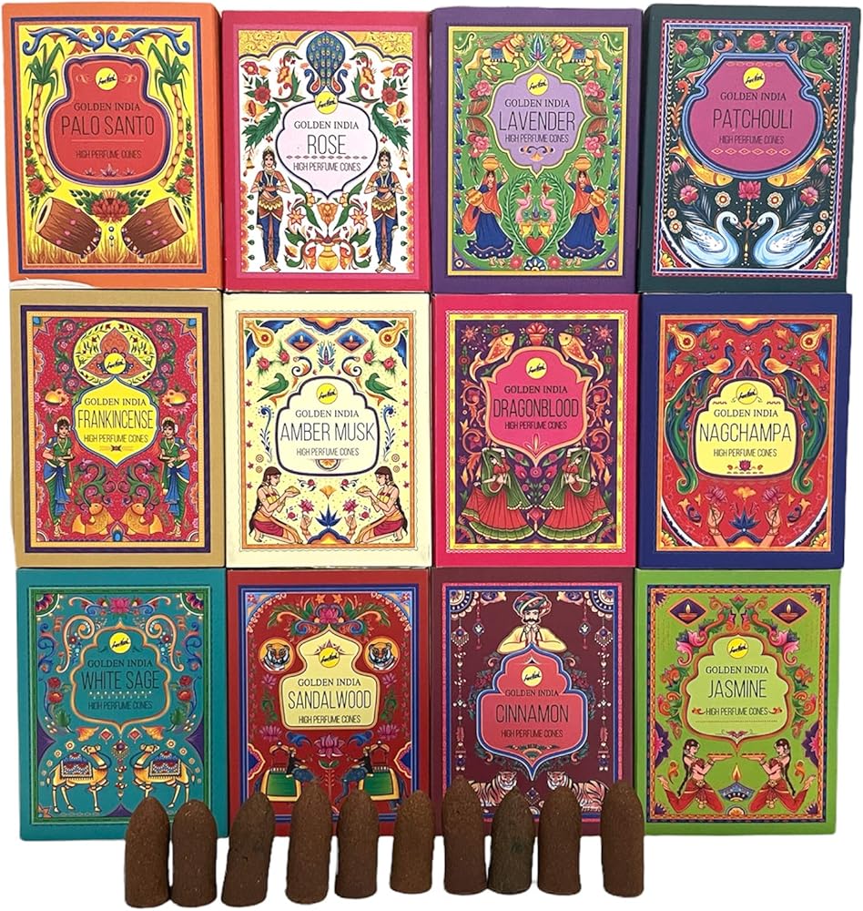 Assorted Highly Scented Sreevani Backflow Incense Cones For Waterfall Aromatic Smoke Fountain Haze Falls And Lotus Burner Bundle - 12 Packets Total 120 pcs of 12 fragrances in very attractive packaging.