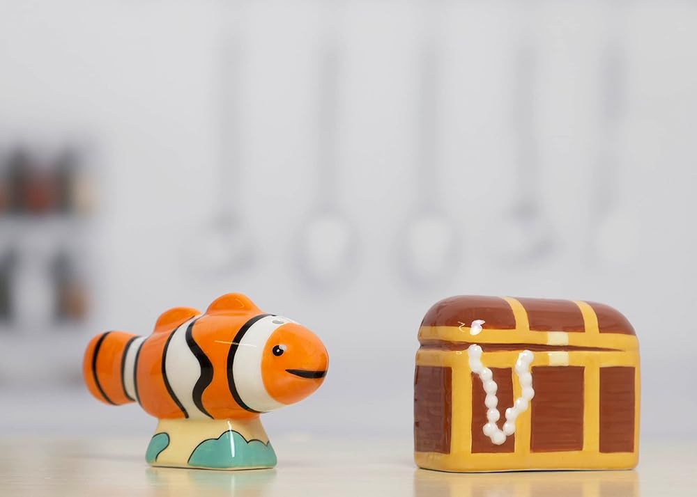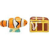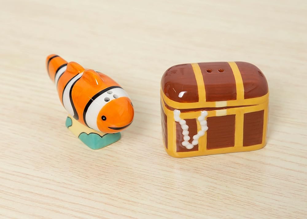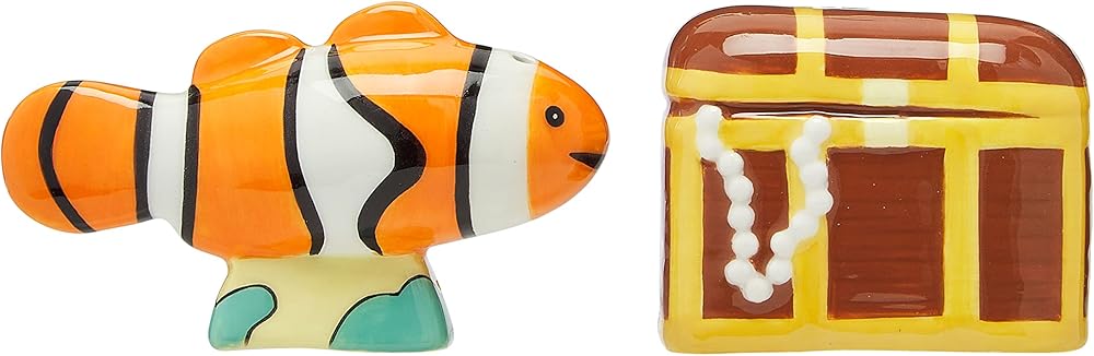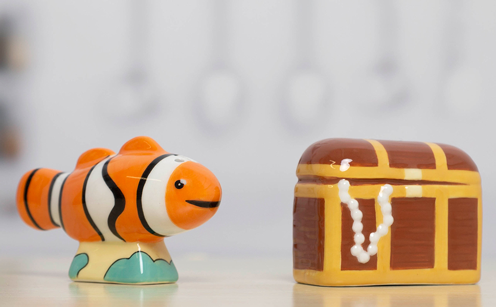 • Includes one orange and white clown fish salt shaker and one brown pirate treasure chest pepper shaker