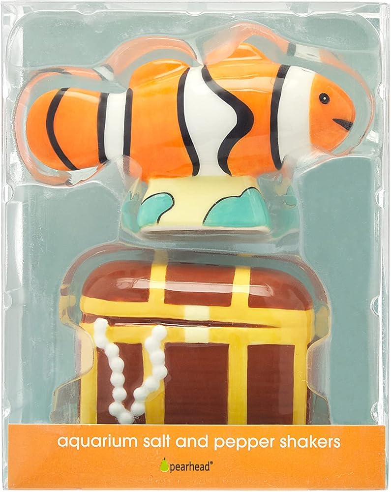 Decorate your kitchen with Pearhead's Under the Sea Salt and Pepper Shaker Set. This adorable set is the perfect kitchen accessory for any nautical or beach themed home! This novelty home décor set includes one orange and white clown fish salt shaker and one sunken pirate treasure chest pepper shaker. Each shaker includes a rubber stopper, making filling and cleaning simple and easy! Add these fun and functional ocean themed shakers to your dining room table or kitchen counter. This whimsical set makes the perfect novelty home décor gift, holiday gift, housewarming gift, or gift for any friend of family member in your life. At Pearhead, we aim to create genuine, quality products to celebrate your special moments in life. We are a family of designers, marketers, and trendsetters bringing products to life that will bring a smile to your face. From concept to design to production and customer service, the Pearhead team works together seamlessly every step of the way. Whether your baby is celebrating their first year of life, you are announcing your pregnancy, or your pup is celebrating his first holiday season, Pearhead is here to share your moments in style. Shakers measure approximately: 2”W x 3”D x 2”H