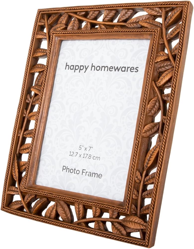 Classic and vintage resin sculptured picture frame with floral leaf design in a rustic antique copper finish with double rope inner and outer trim.