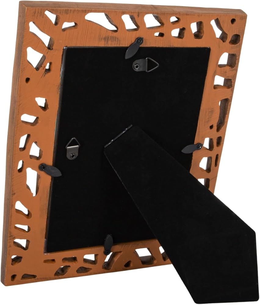 Classic and vintage resin sculptured picture frame with floral leaf design in a rustic antique copper finish with double rope inner and outer trim. Please note that this frame is hand-painted giving a vintage and classic look and would make a beautiful gift for any occasion or to be used in the home or business. This model can be used for vertical and horizontal table free standing as well as wall hung using the attached D-ring clips. This double bevelled rectangular picture frame holds a single 5" x 7" photograph. The actual frame measurements are as follows: Height - 9", Width - 7.5". Complete with luxurious black velveteen backing and mounted strut and clear glass front protective cover.