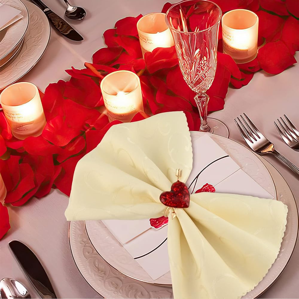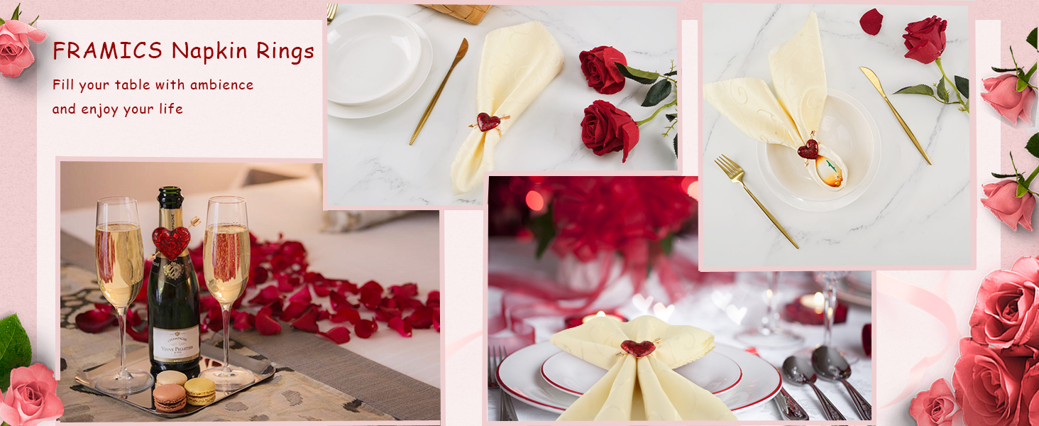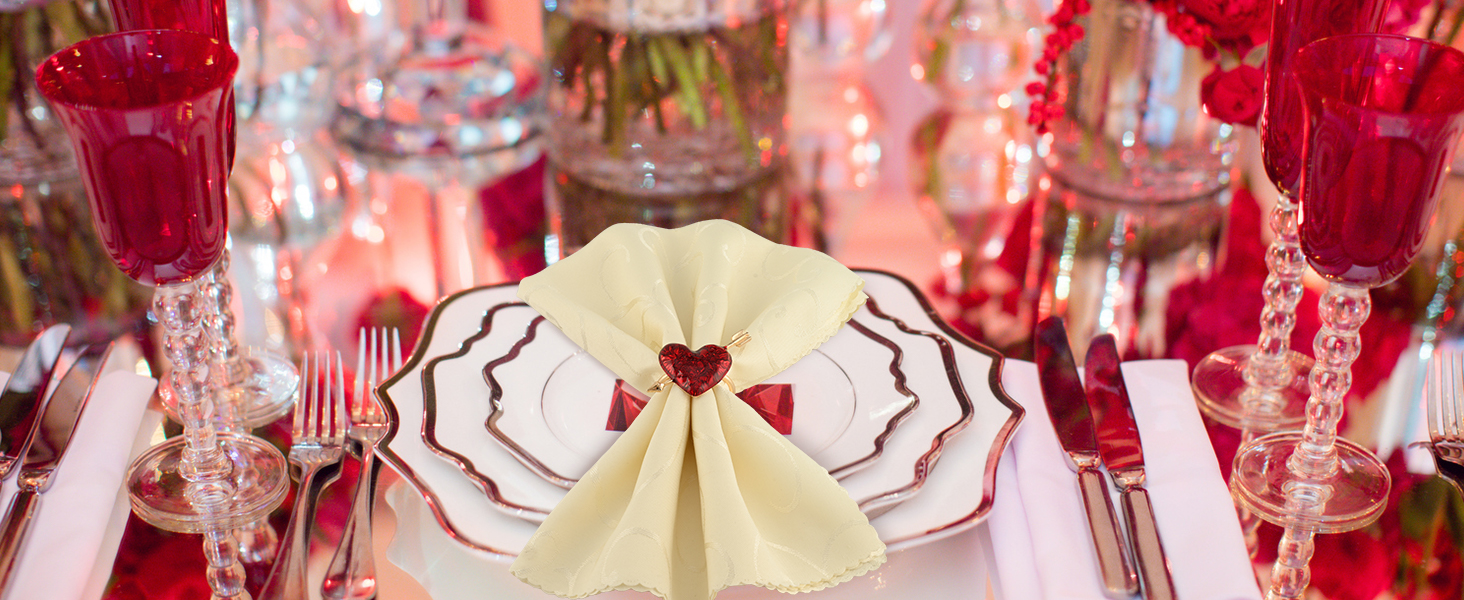 تصميم فريد: حلقة المناديل عبارة عن تصميم على شكل قلب لإضافة الكثير من نمط العطلات الرومانسي إلى طاولتك. اللون الذهبي يجعل المقعد الدائري أكثر أناقة ويضيف لونًا رقيقًا إلى طاولتك. تضيف حلقات المناديل الحمراء على شكل قلب لمسة نهائية إلى أدوات المائدة الخاصة بك.