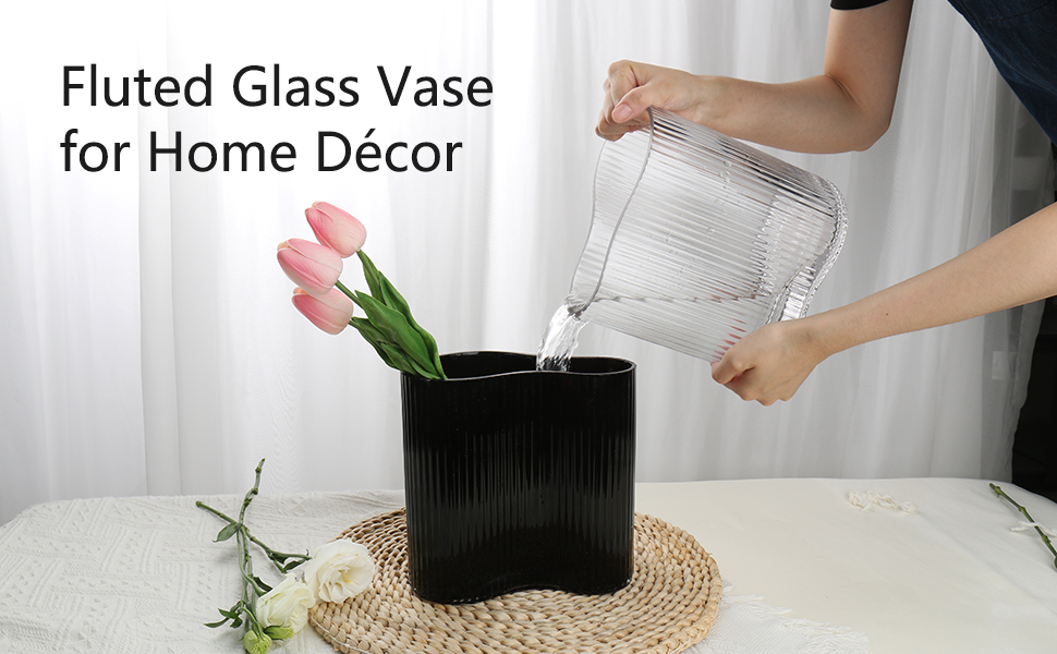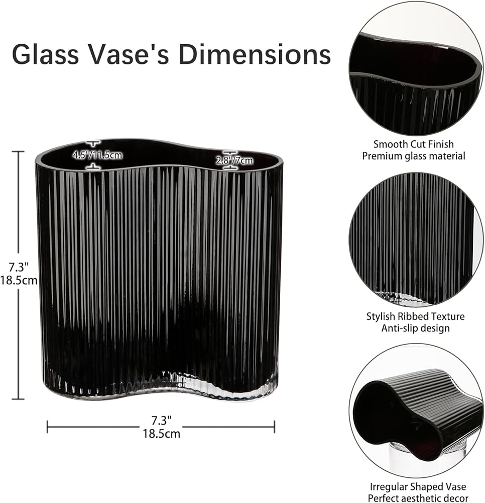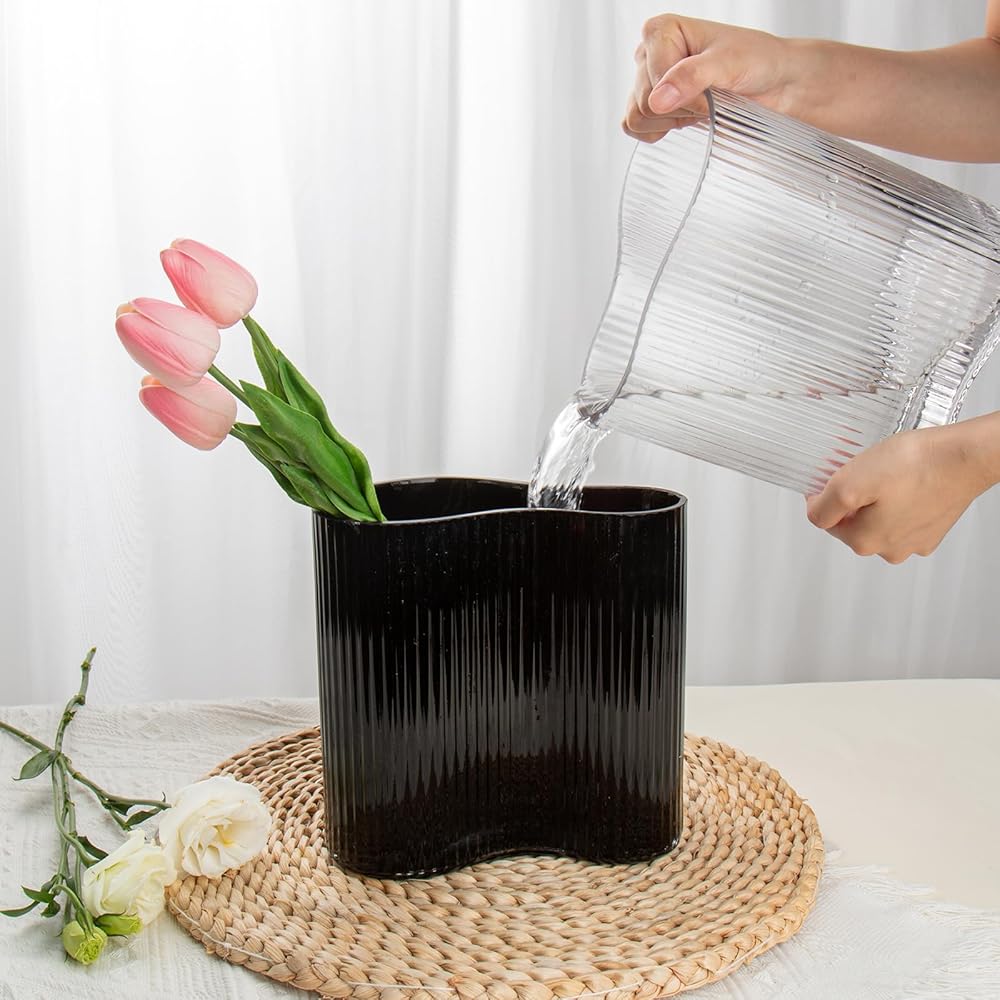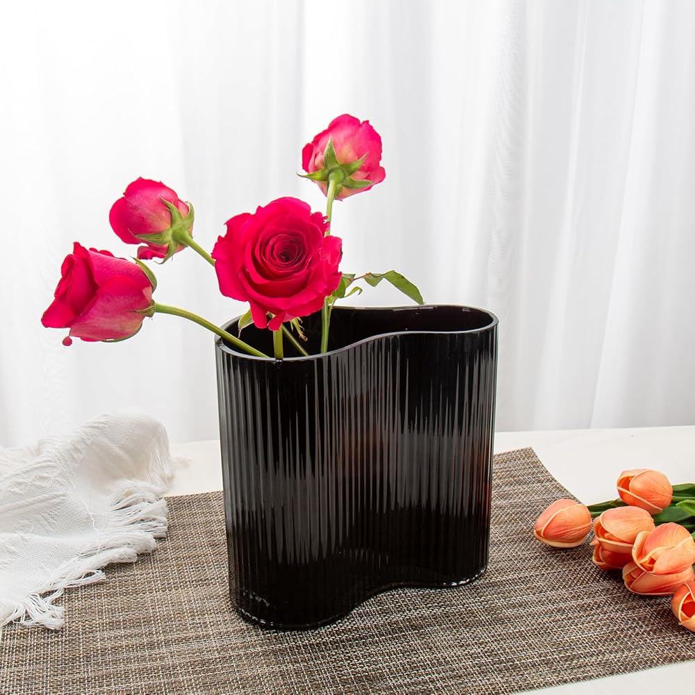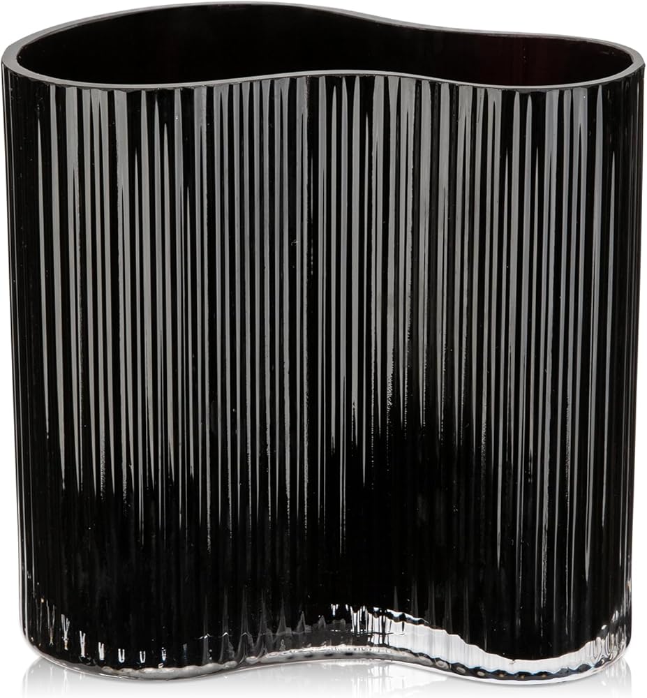مزهريات سوداء للديكور - تتميز هذه المزهرية الزجاجية بشكل مستطيل، يتم إطلاقها في درجة حرارة عالية، ولها تصميم غير متماثل، مع نسيج مضلع على سطحها، مما يجعلها رائعة ومميزة، المزهرية الزجاجية ستجعل ترتيبات الزهور الخاصة بك تبرز أكثر. ألوانها الواضحة وتصميمها البسيط يمكن أن يناسب أي نمط ديكور منزلي (الزهور غير متضمنة)