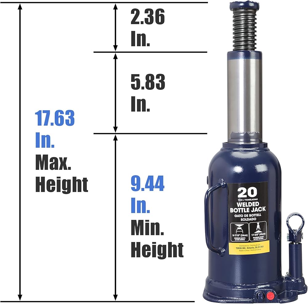 Lifting range of 9-7/16" to 17-5/8" with 20 ton (40,000 lb) capacity; Lifting height of 5-7/8" and an adjustable screw top extension adds extral height of 2-3/8".Easy to carry and place in the trunk of vehicles,and easily lift car with the heacy duty bottle jack.