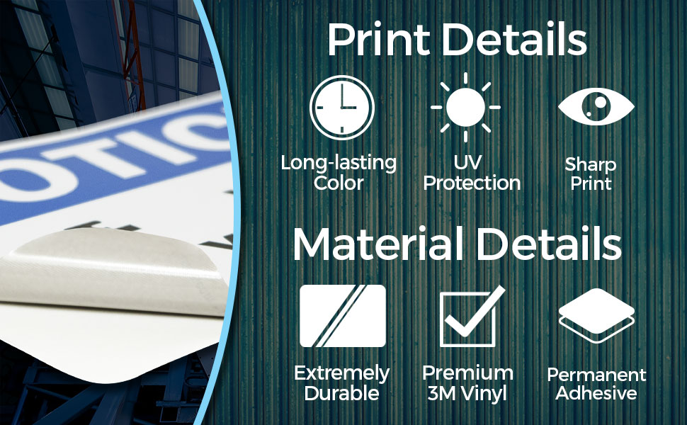 • SIZE & SPECS: 10" X 7" Vinyl Decal - This Notice Decal is also available as a heavy-duty PVC sign or as a super strong aluminum sign.